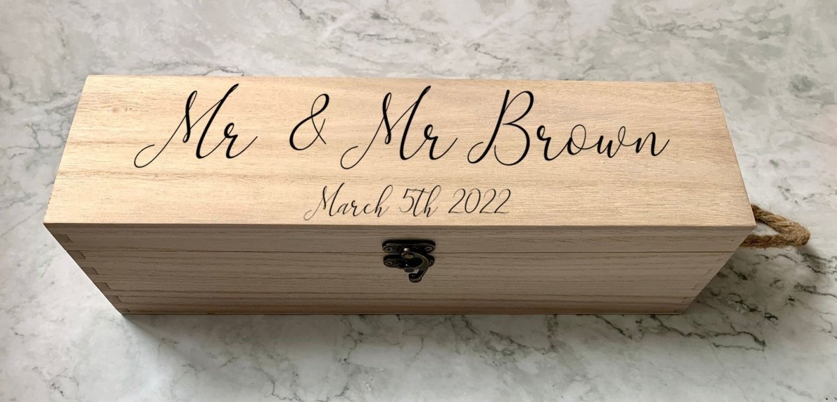 Elevate any wedding celebration with our Personalised Mr & Mrs Wedding Wine Bottle Gift Box. Crafted from high-quality wood and engraved with the couple's name, this box adds a personal touch to any wine or champagne bottle. It's the perfect gift for the newlyweds, making their special day even more memorable.