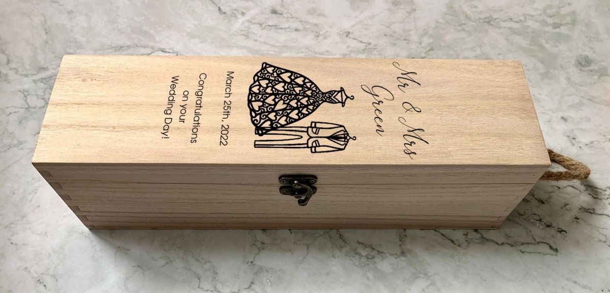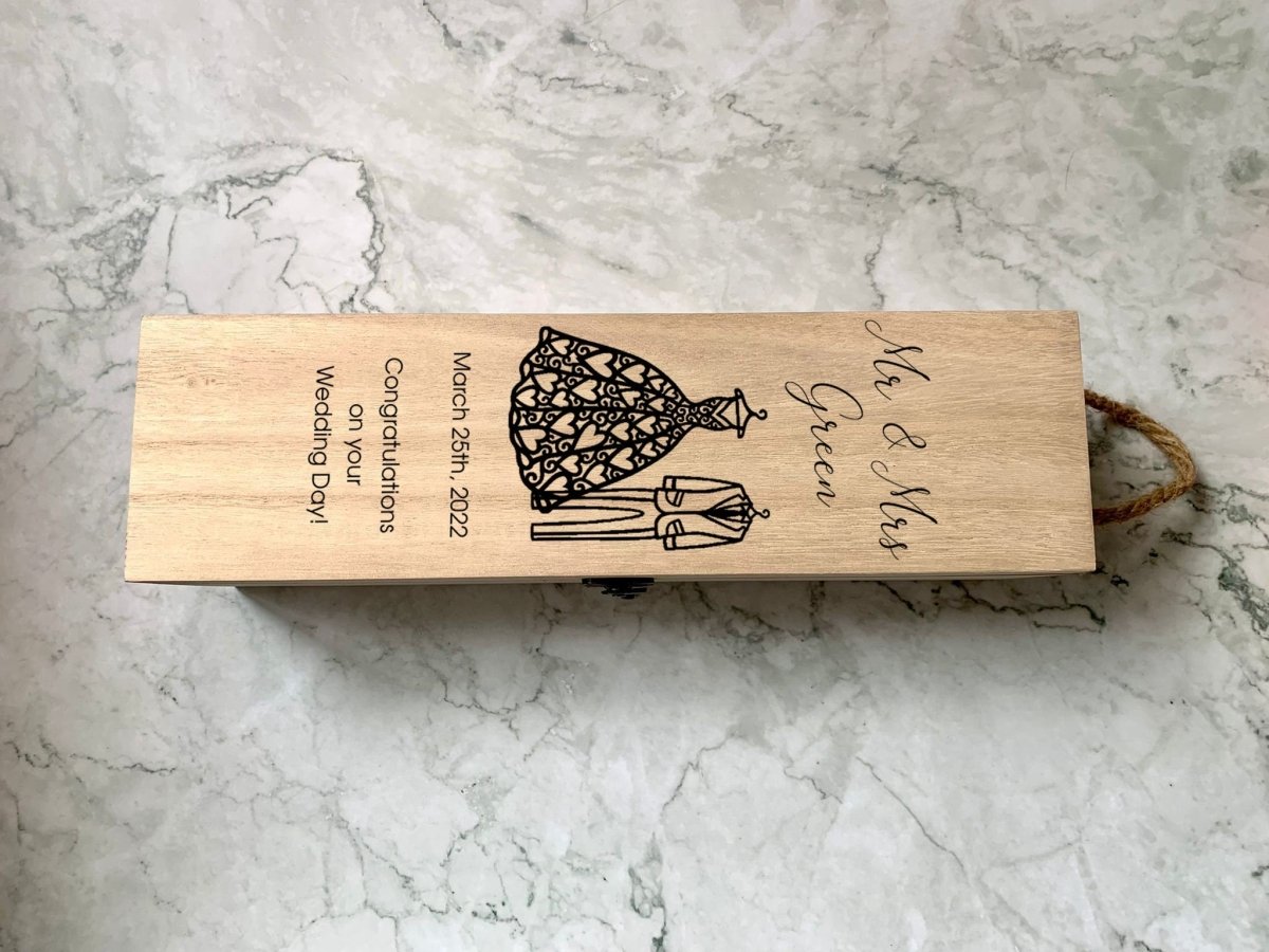 Personalised Mr & Mrs Engraved Wooden Wine Bottle Gift Box with Wedding Dress and Suit