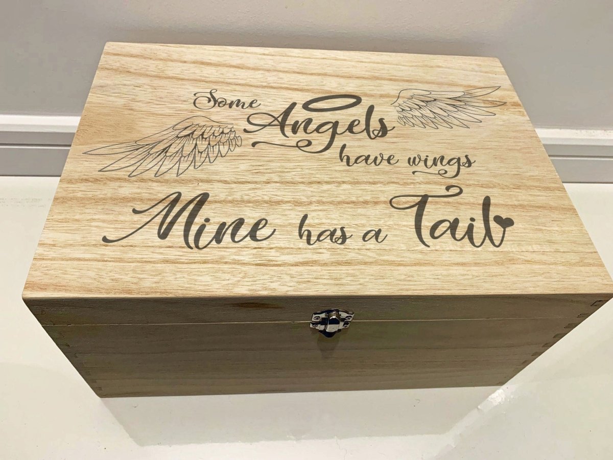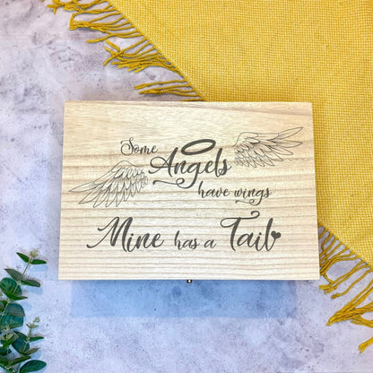 This personalised pet memory box is the perfect way to honour your furry angel. Made of high-quality wood, it features a touching engraved message: "Some angels have wings, mine has a tail." Keep your beloved pet's memories safe in this custom-made box.