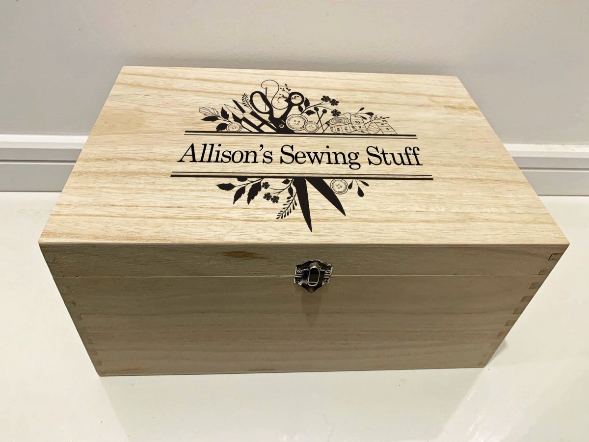 This wooden sewing box can be personalised with your name in a monogram design, featuring sewing scissors, needle and thread, making it a unique and thoughtful gift for any sewing enthusiast. Stay organised and stylish with this personalised sewing box.