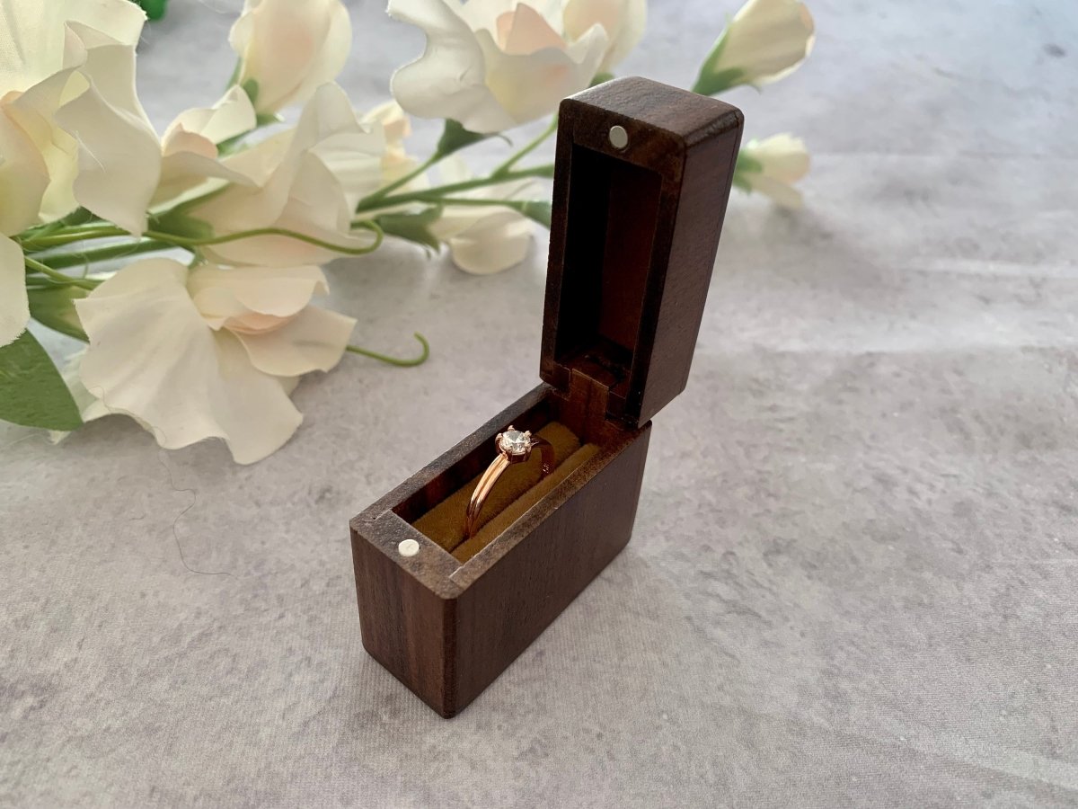 Securely store your most treasured ring in our Personalised Slim Square Ring Box. Made from walnut wood and engraved with your chosen design, it makes the perfect wedding day, proposal, or anniversary gift. Keep your special moments safe and stylish in this unique and personalised ring box.