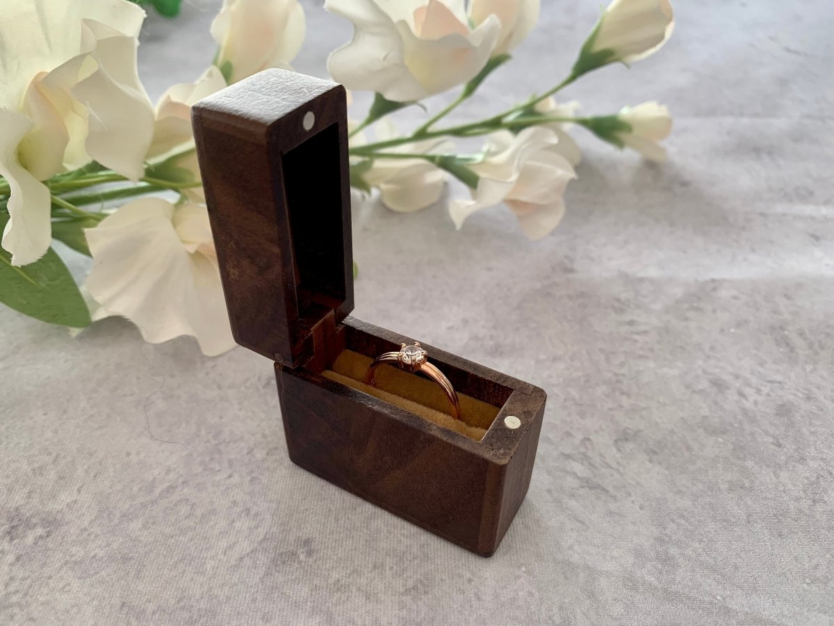 All ring boxes are made from Walnut, and have a choice of velvet inserts.