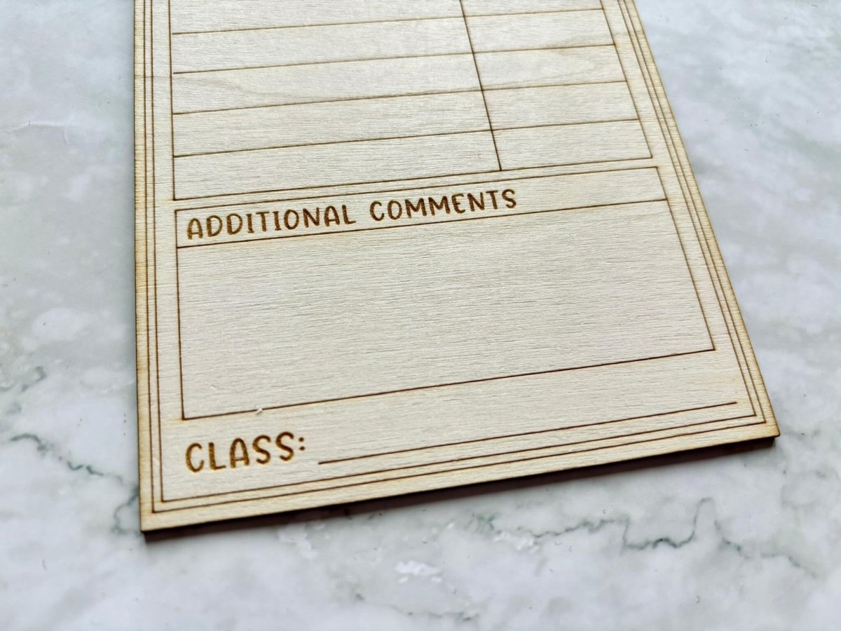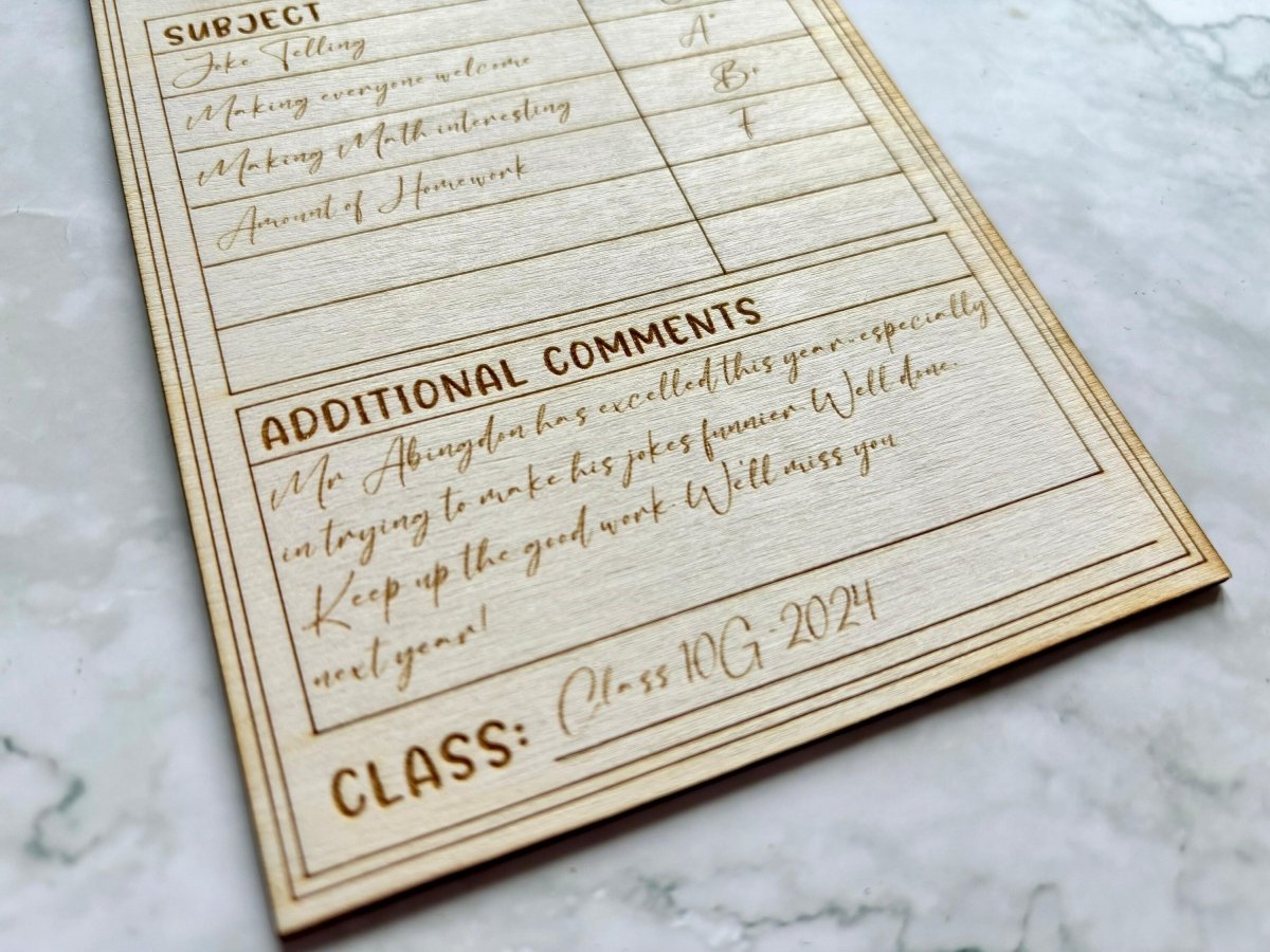 This personalised wooden teacher report card makes for a great gift for teachers. With a funny twist, it's a unique way to show appreciation for all that they do. Engraved with a personal touch, it's sure to make a lasting impression.