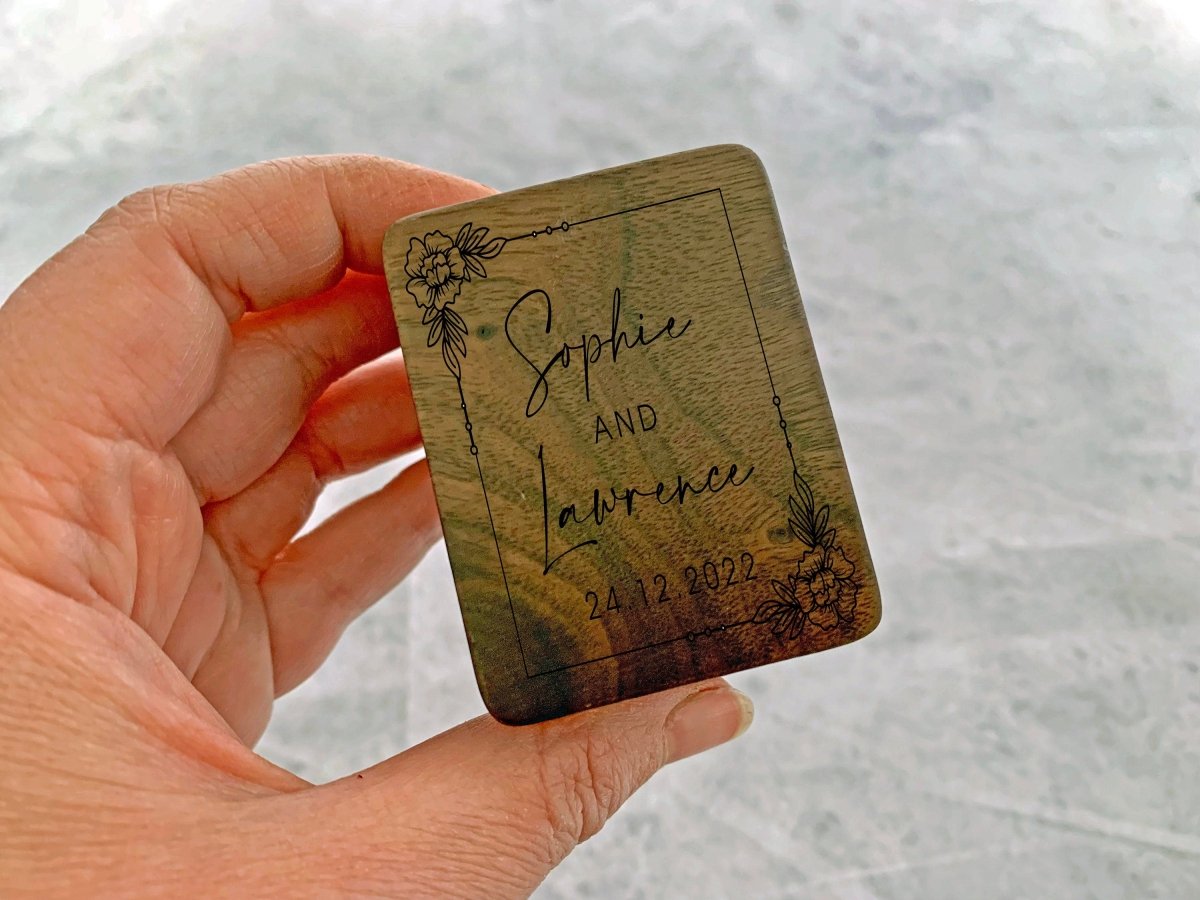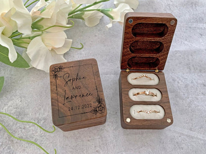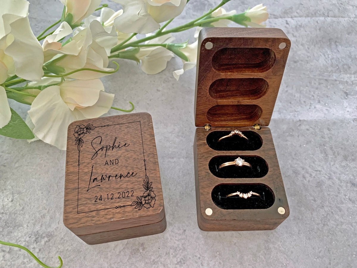 This personalised rectangle engraved wooden wedding ring box is ideal for those looking to store and protect their engagement, wedding, eternity or anniversary rings. The wooden box features a floral design with peonies, adding a romantic touch to any jewellery collection. Perfect as an anniversary gift or a treat for yourself.