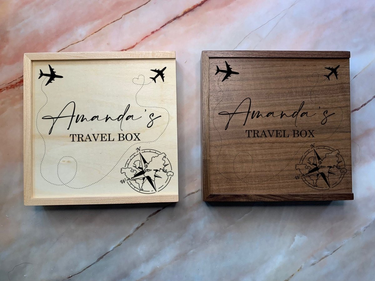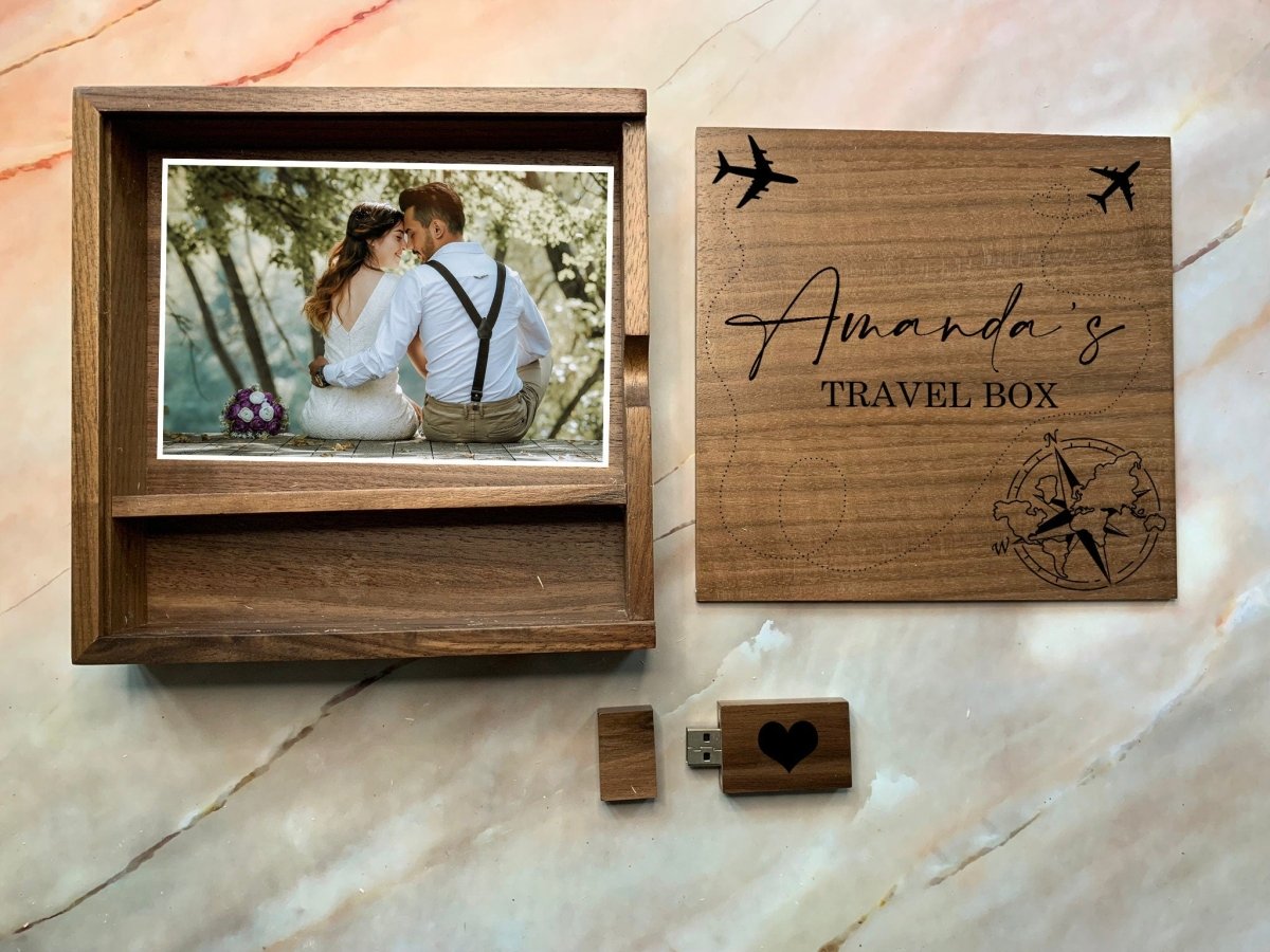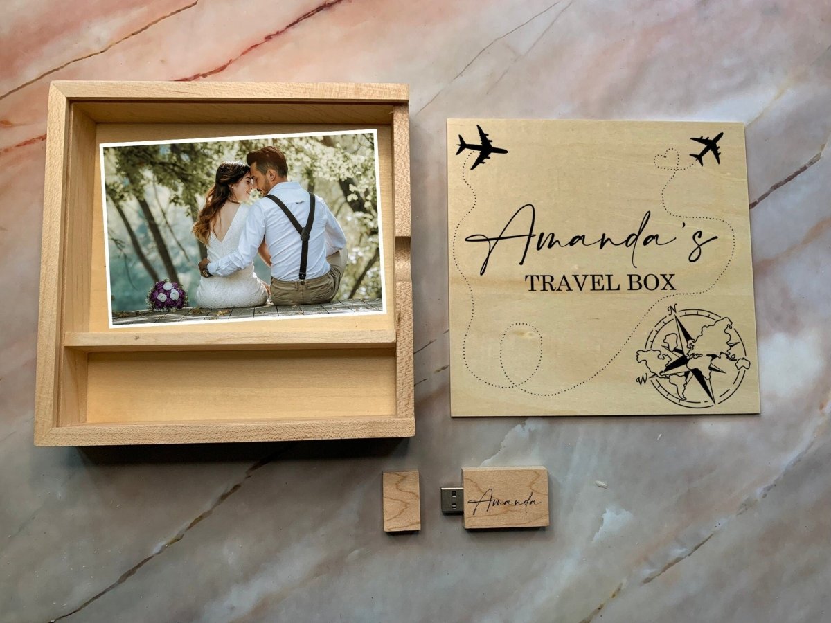 Enhance your travel memories with our Personalised Travel USB Photo Box. Crafted from wood, this box is engraved with a compass design and your name for a unique touch. There is room to store printed photos and a handy USB stick to keep digital copies as well, perfect for storing your treasured travel memories.