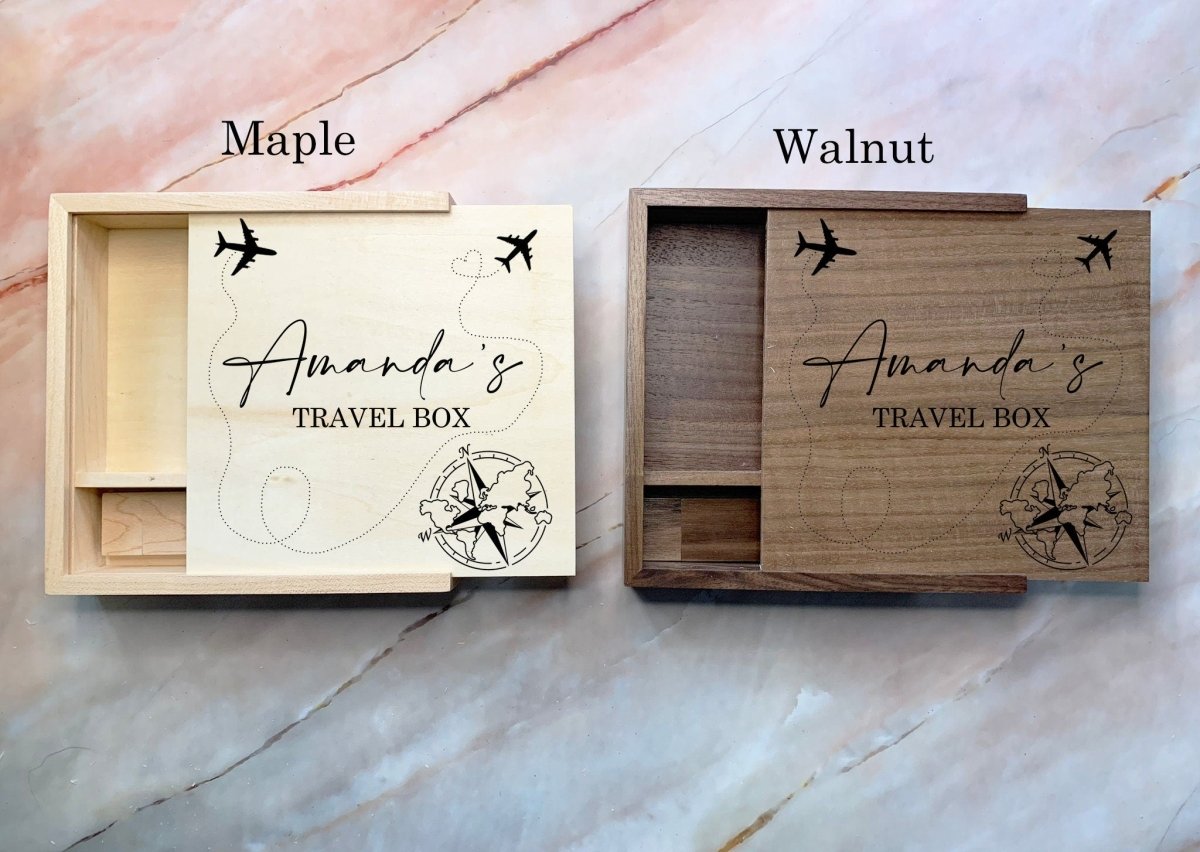 Personalised Travel Flash Drive USB Stick With Large Wooden Box in Maple or Walnut, 4GB, 8GB, 16GB, 32GB, 64GB