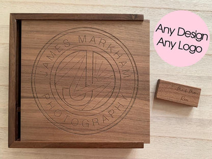 Personalised Logo Flash Drive USB Stick With Large Wooden Box in Maple or Walnut, 4GB, 8GB, 16GB, 32GB, 64GB with custom logo design