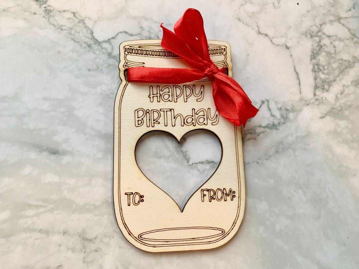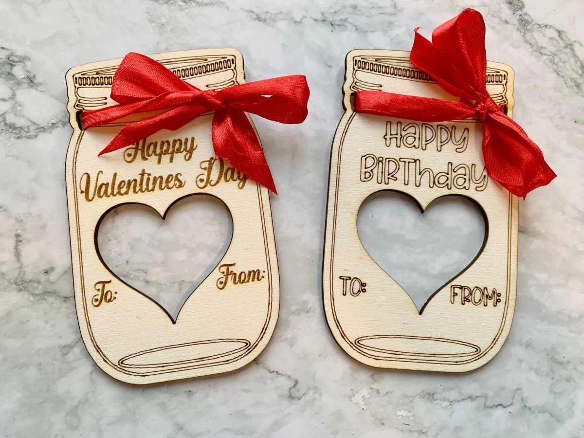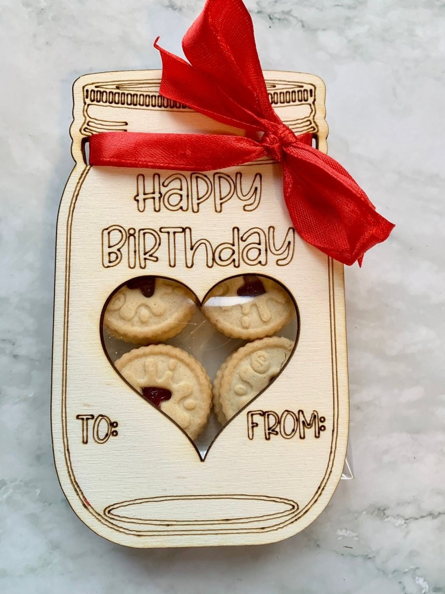 Each wooden engraved mason jar is professionally laser etched and comes with a zip lock bag that can be attached to the back of the engraving and filled with your choice of treat. There are also two holes for attaching a ribbon and a bow, which we can either do in house with red ribbon, or leave blank to attach your own coloured ribbon.