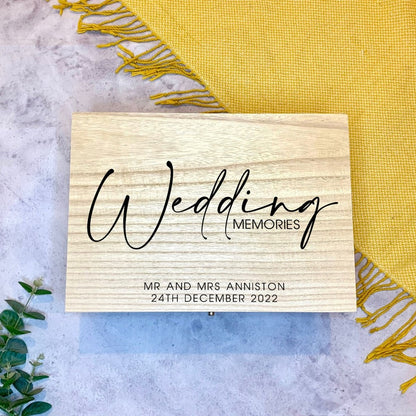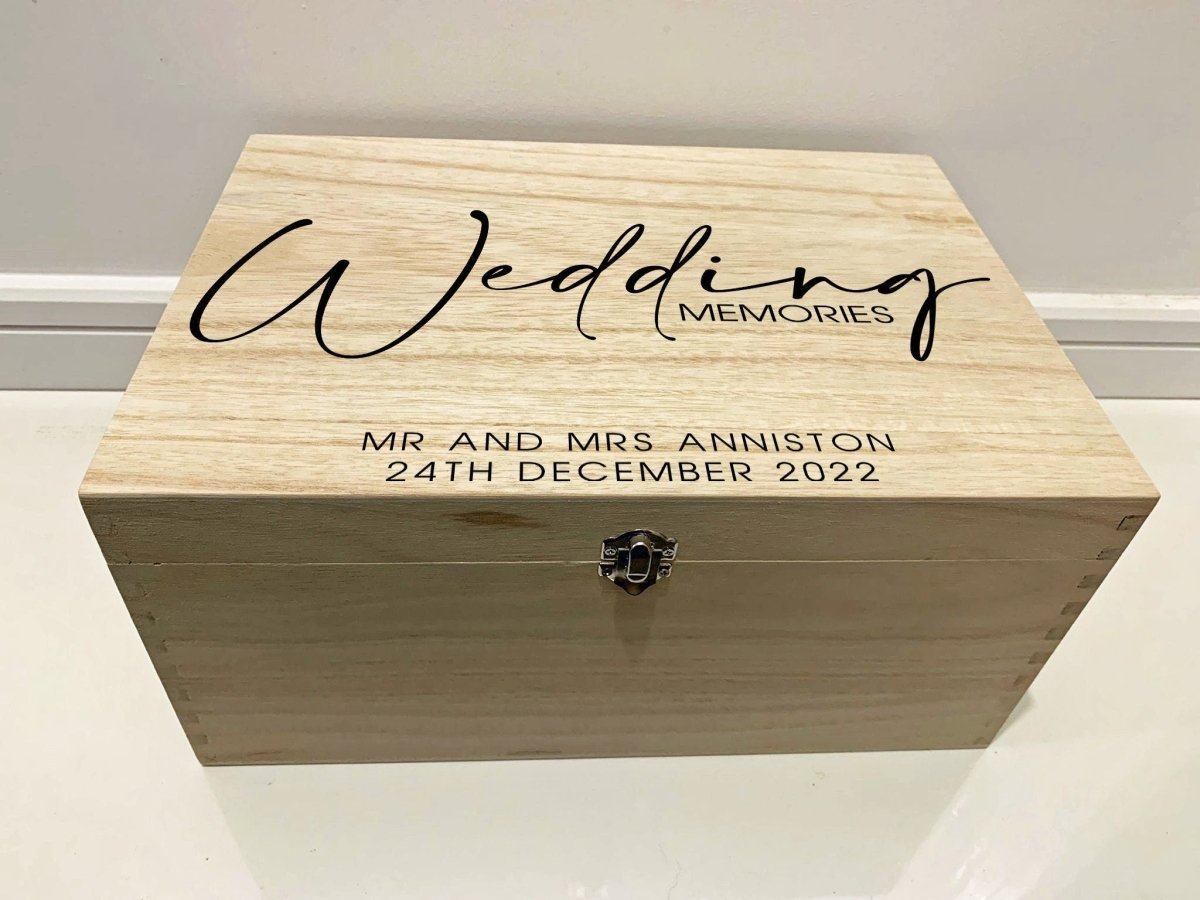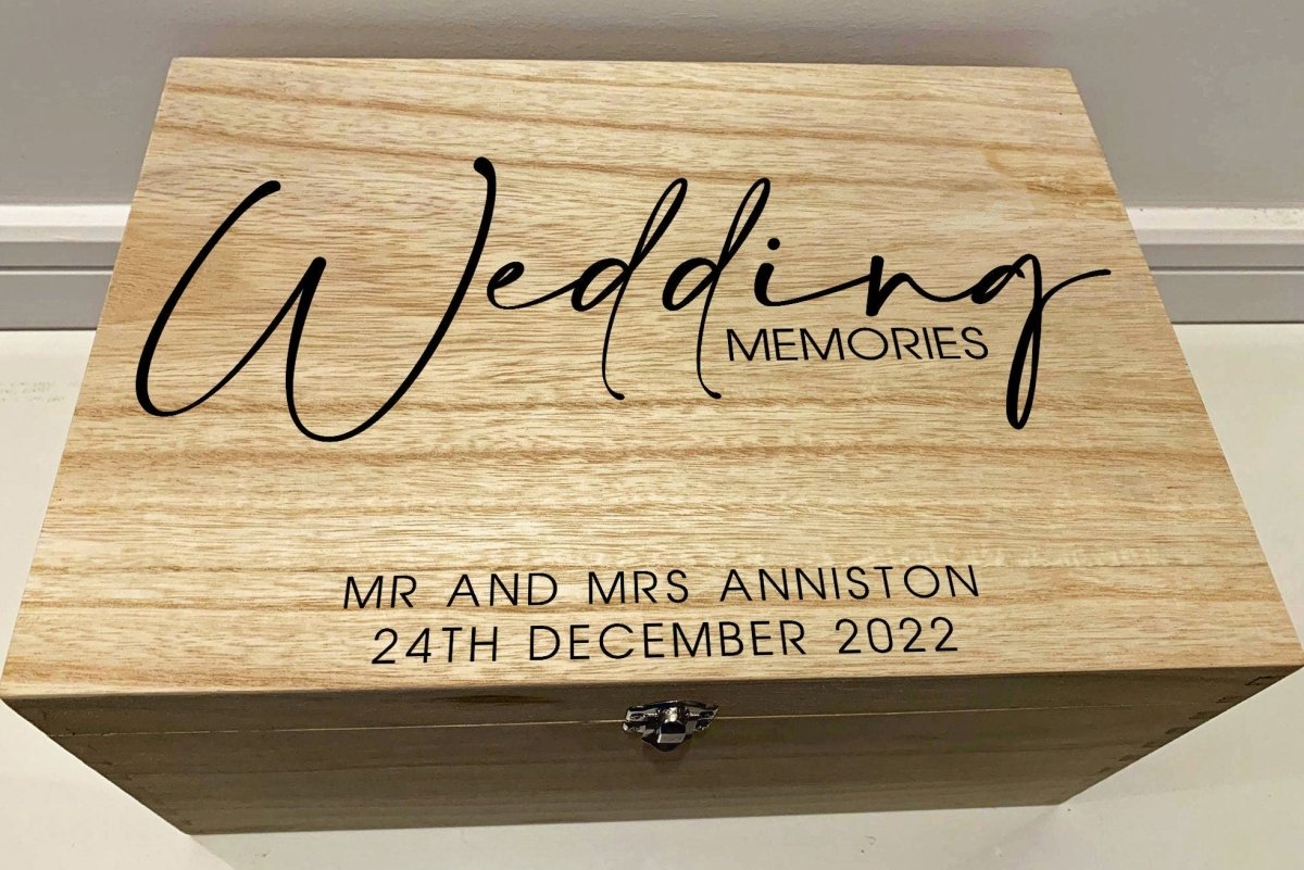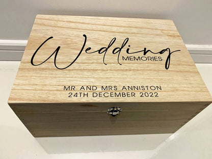 As a personalised wedding keepsake box, our Wooden Wedding Memories box is a unique way to store and treasure your special day. Beautiful engraved with the words "Wedding Memories" you can also engrave your names and wedding date on the wooden box to keep your most cherished wedding memories safe and secure.