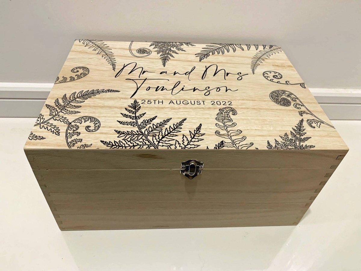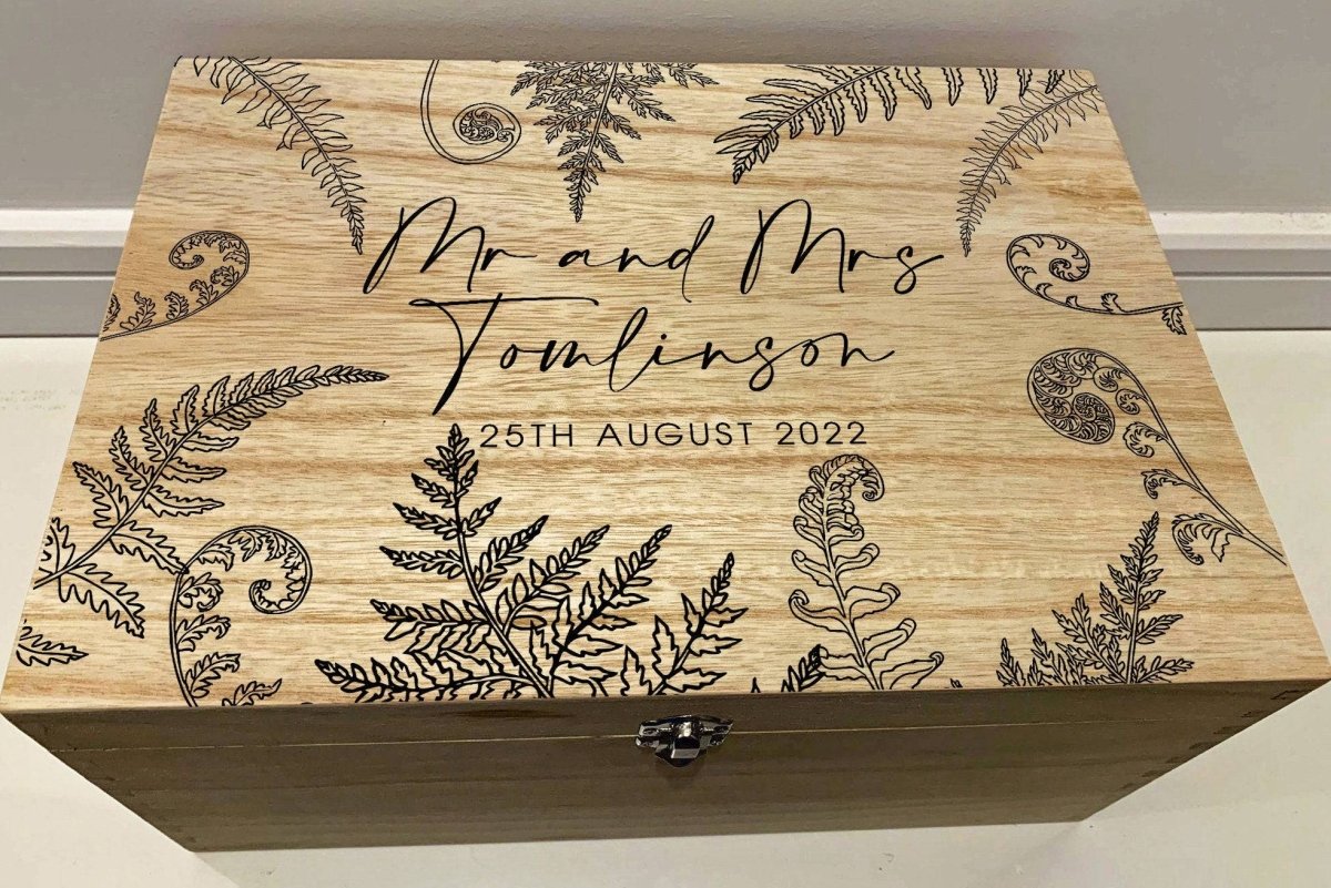 This large personalised engraved wooden wedding memory keepsake box is a perfect wedding gift for couples wanting to store their treasured memories for years to come. The natural wood finish and engraved ferns add a touch of woodland beauty. A meaningful, lasting gift.