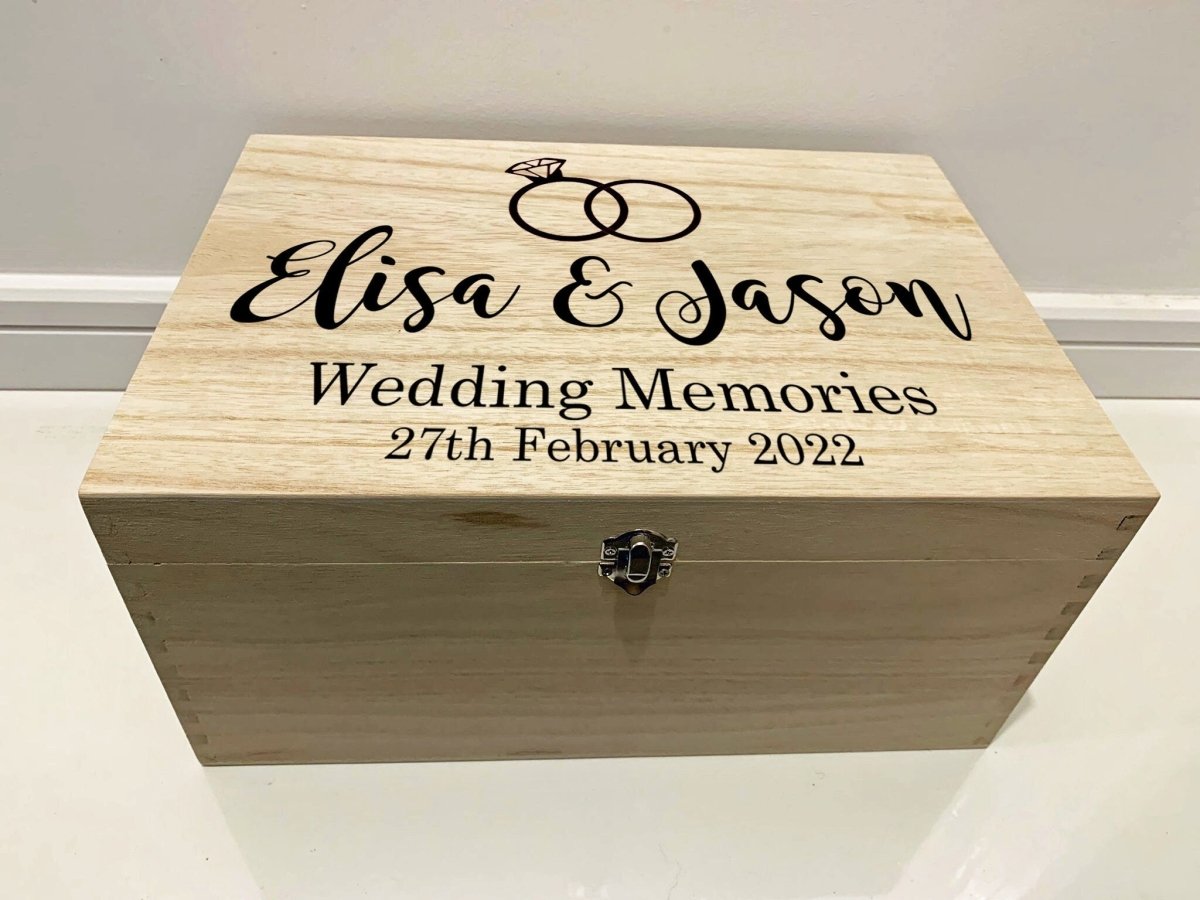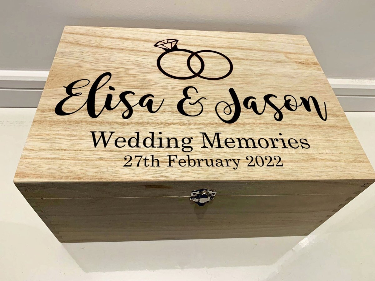 This personalised wooden wedding keepsake box is the perfect way to preserve your wedding memories, engraved with a pair of rings and your names and wedding date for a truly special touch. The elegant design and custom engraving make for a unique and cherished piece to remember your special day.