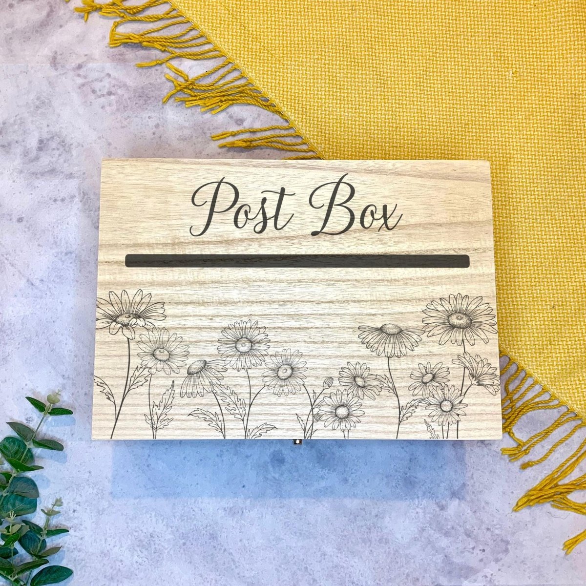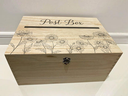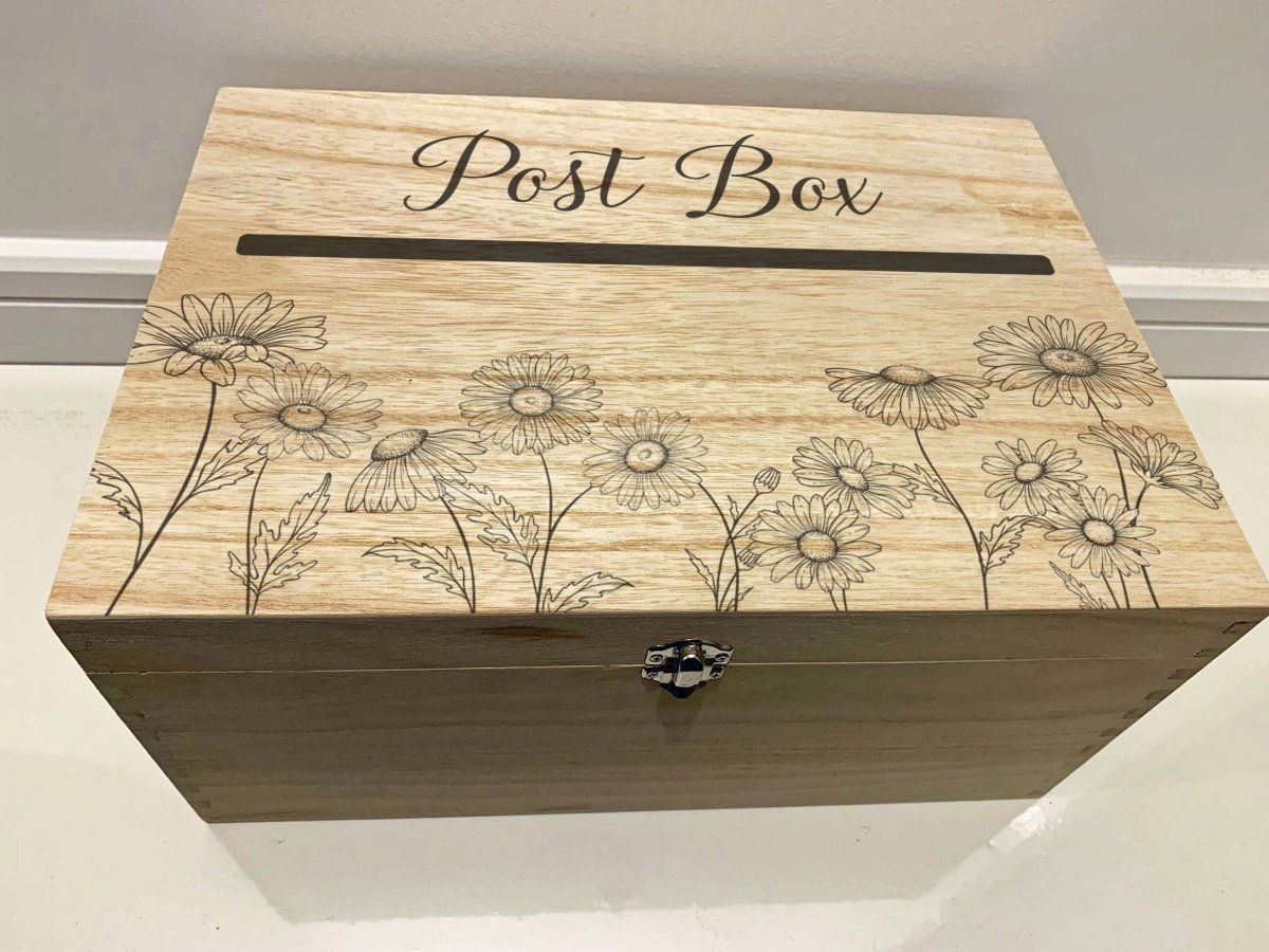 Beautifully crafted this Wedding Card Post Box is the perfect addition to any rustic or nature-inspired wedding. Featuring beautiful daisy engravings, it adds a personal and elegant touch to your special day. Create a memorable and secure space for your cards with this elegant post box.