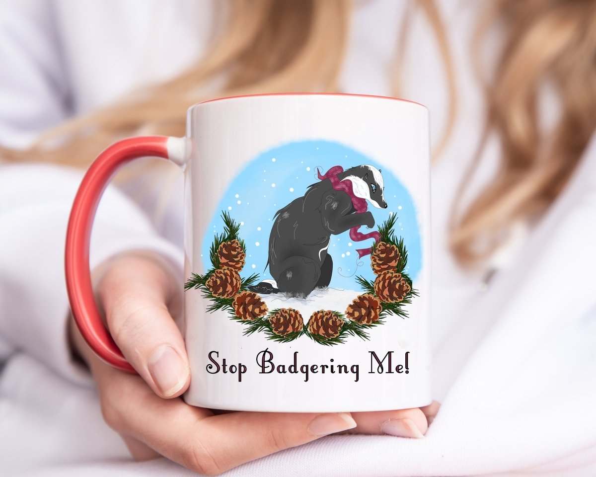 The cute woodland animal mug is the perfect Christmas gift, featuring a beautifully illustrated badger, surrounded by a swathe of pinecones and the words Stop Badgering Me!