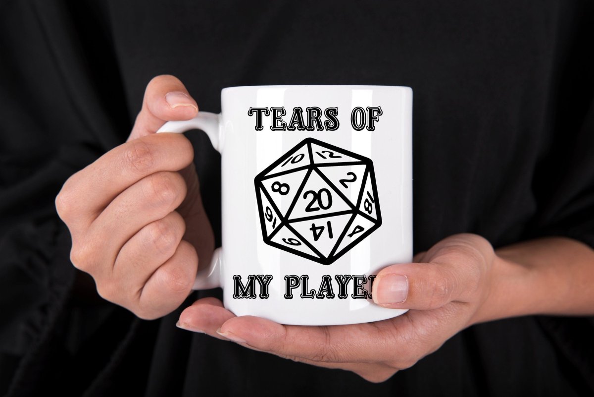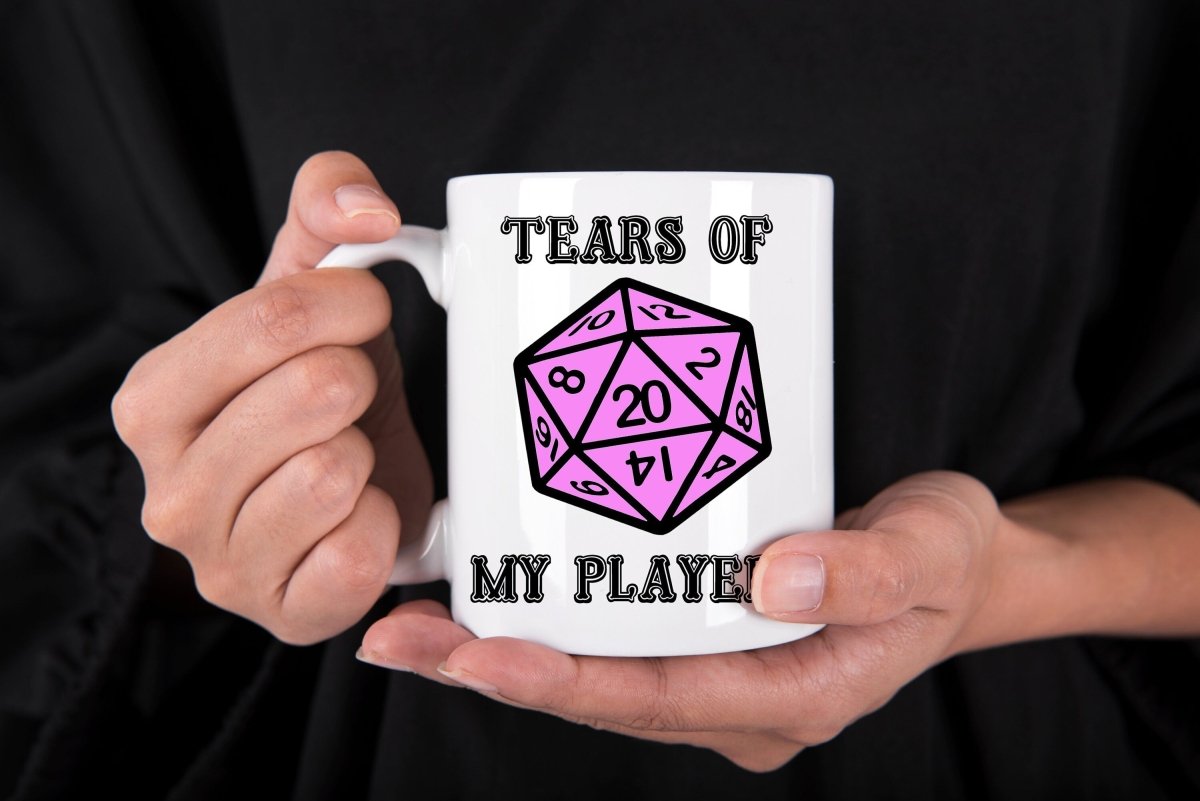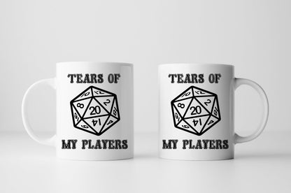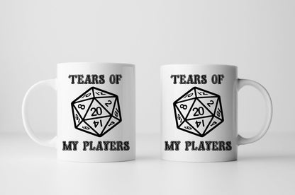 This ceramic mug is a must-have for any dungeon master, featuring the iconic 1d20 dice and the phrase "Tears of my Players" for a touch of humour. Show off your DnD expertise with every sip.