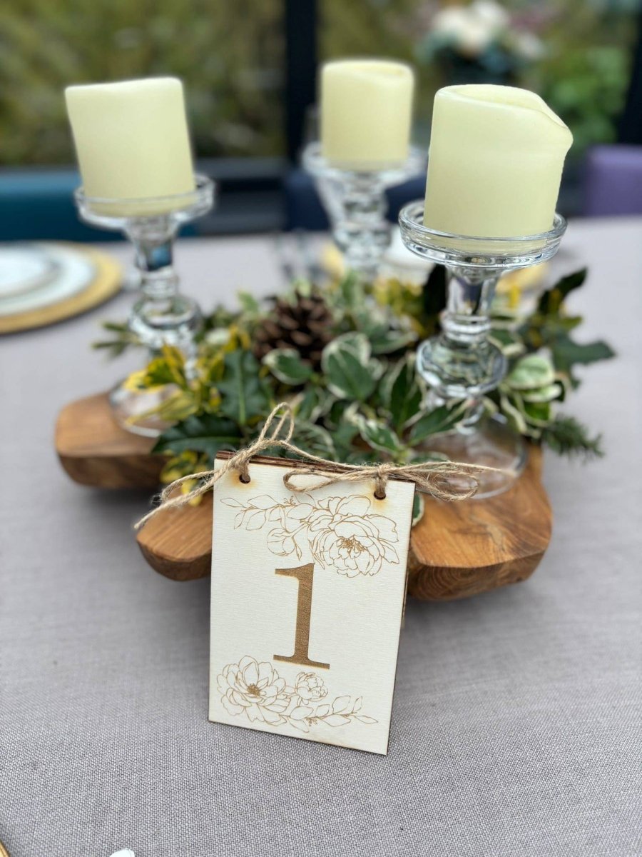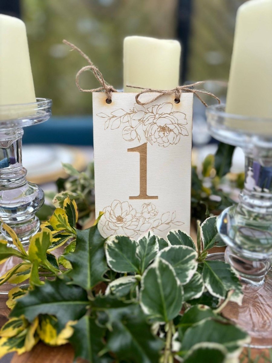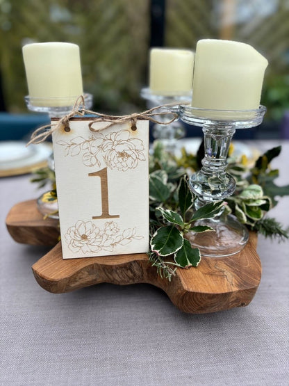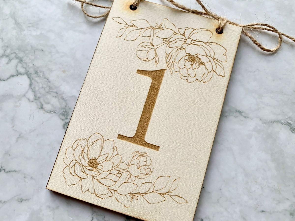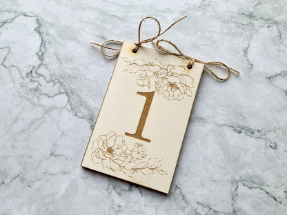 Enhance the elegance of your rustic wedding or celebration with our engraved wooden table number signs, featuring intricate peony designs. Crafted with precision, these signs add a touch of sophistication to any table setting, making it easy for friends and family to locate their dining places at your special event