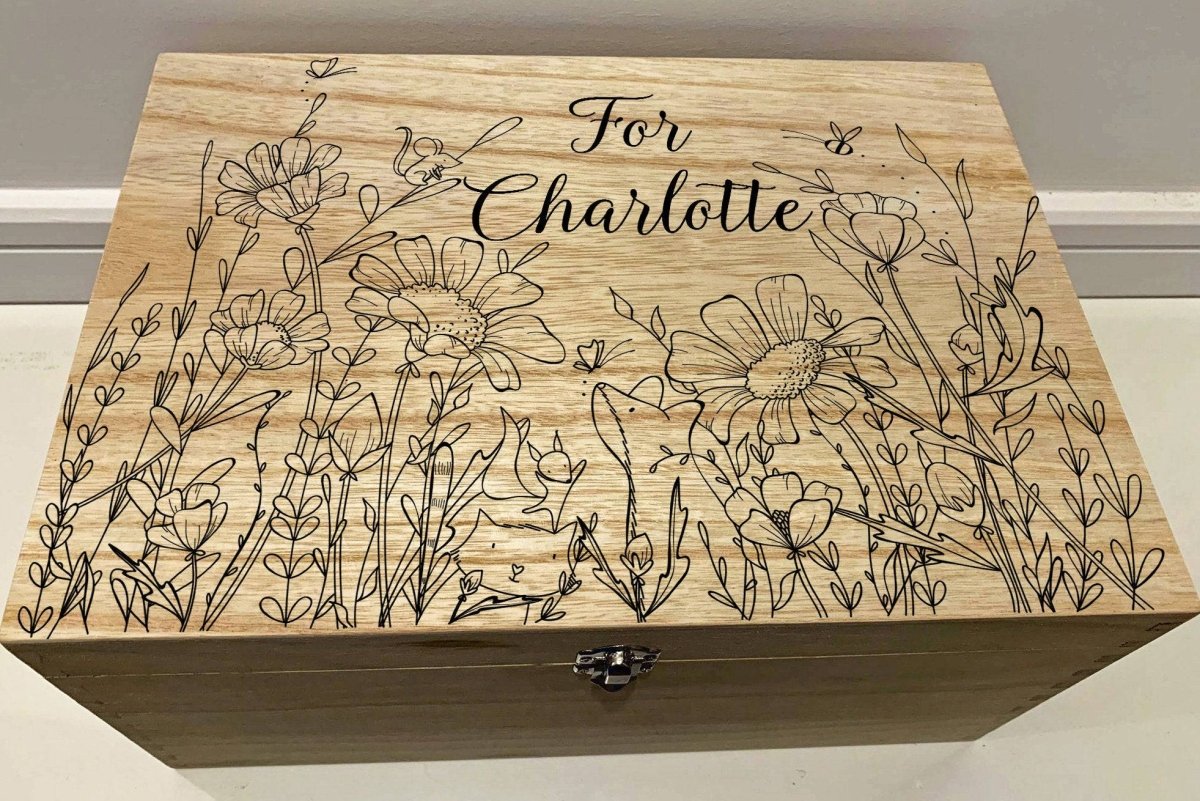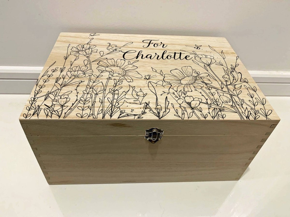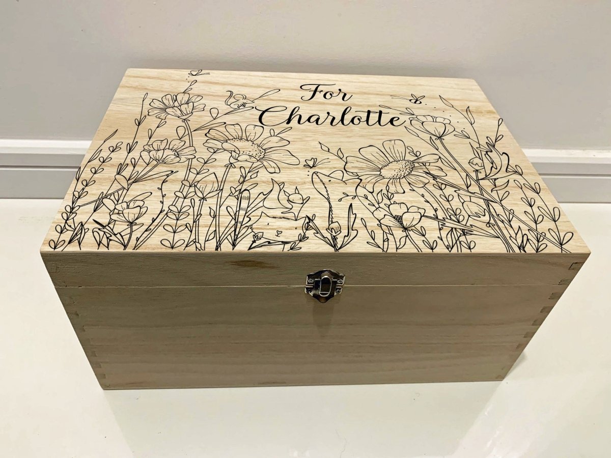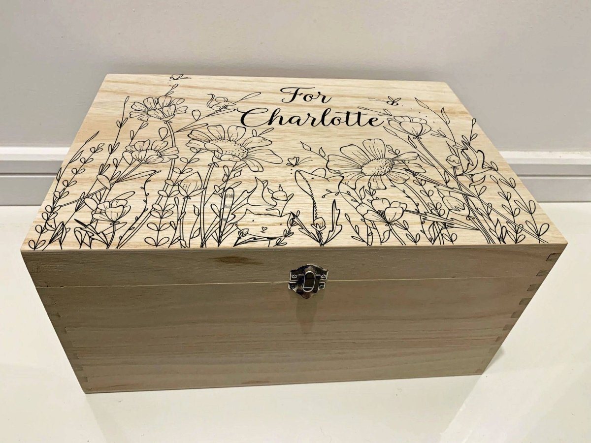 Wild Flower Meadow Childrens Keepsake Box. Large Personalised Engraved Wooden Keepsake Memory Box with Wild Flower Meadow, Butterfly, Mouse, Fox, Bees