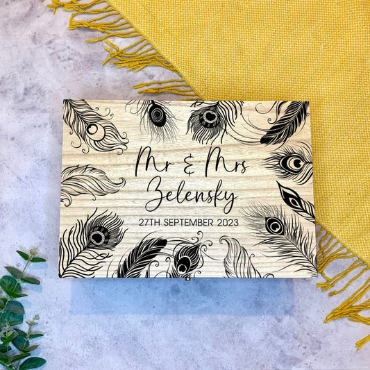 大型个性化雕刻木制婚礼纪念品记忆盒,带孔雀羽毛