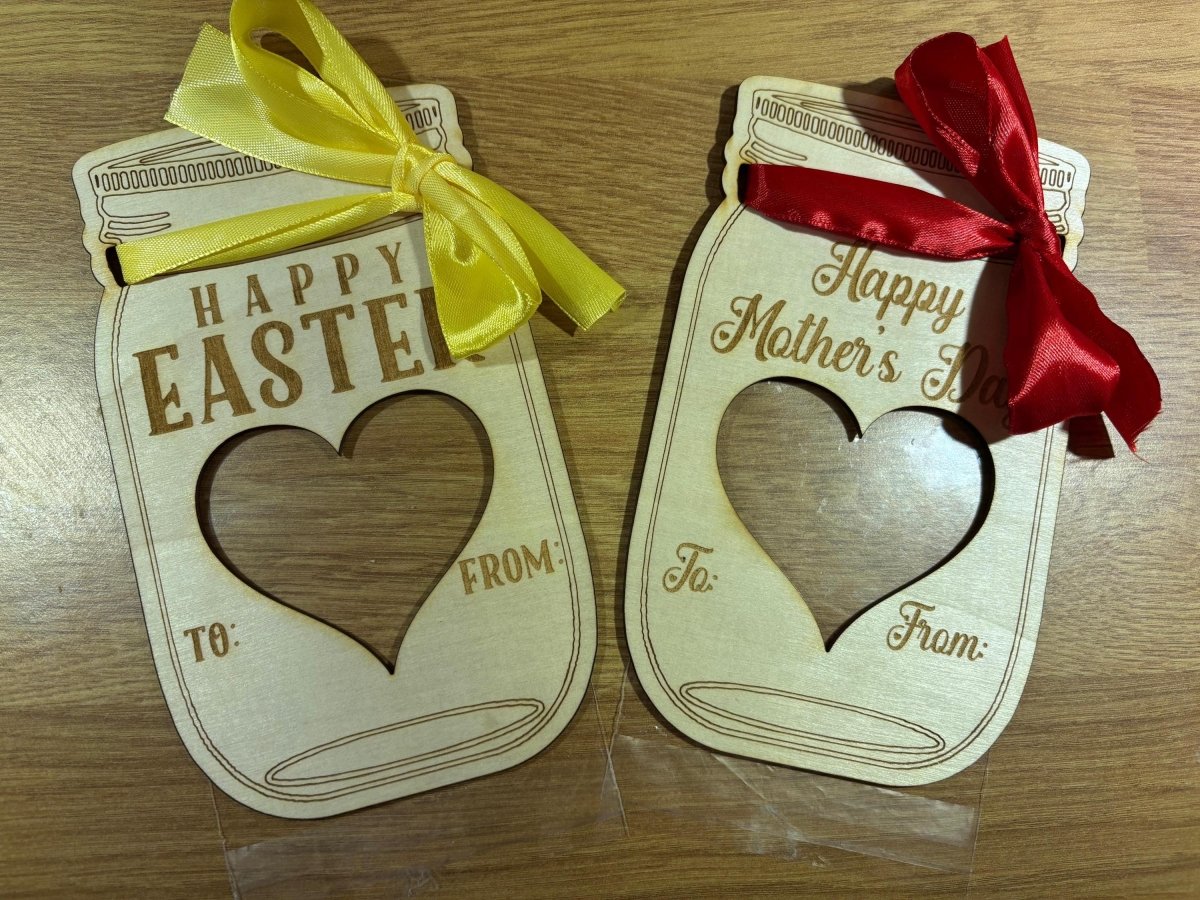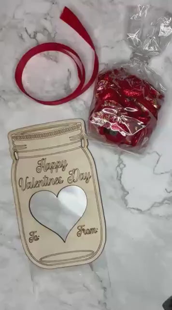 Each wooden engraved mason jar is professionally laser etched and comes with a sealable bag that is attached to the back of the engraving and can be filled with your choice of treat. There are also two holes for attaching a ribbon and a bow, which we can either do in house with coloured ribbon, or leave blank to attach your own coloured ribbon.