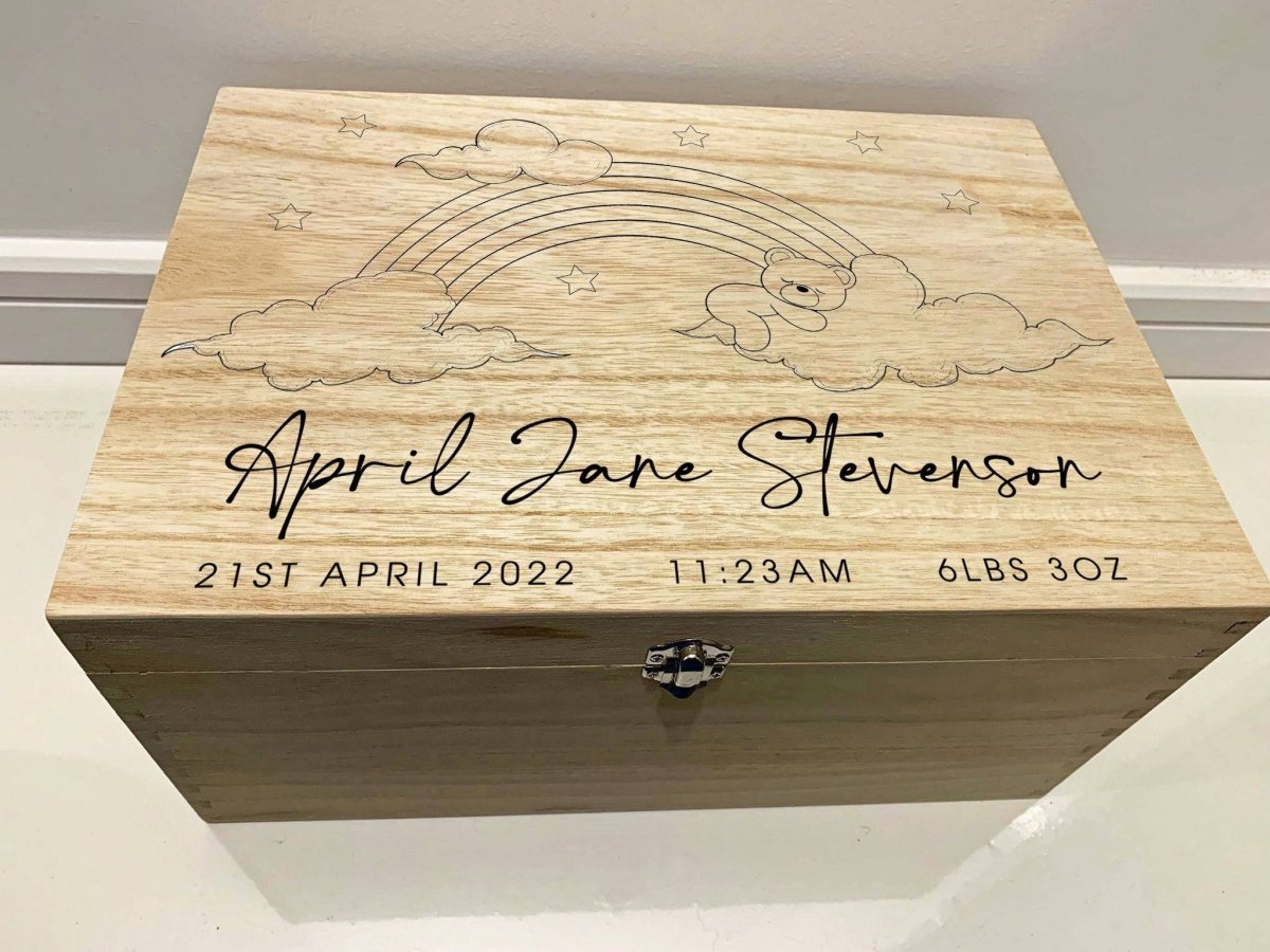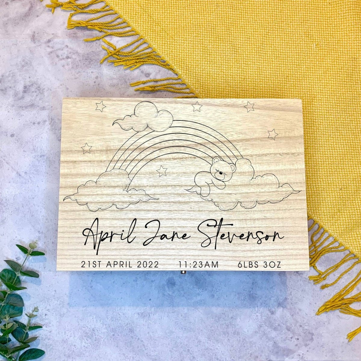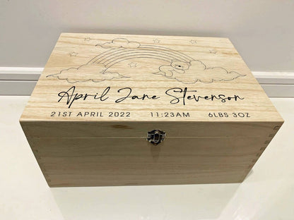 大型个性化雕刻木制婴儿纪念品记忆盒,云朵中的小熊宝宝,彩虹宝宝