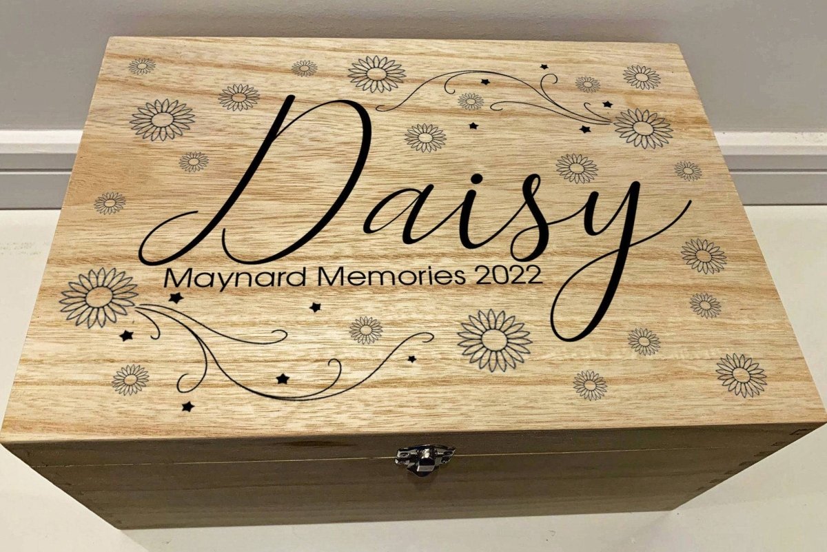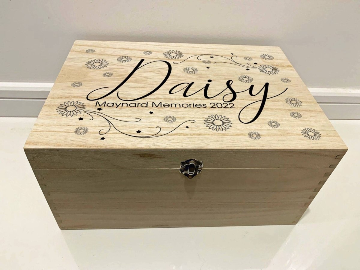 大型个性化雕刻木制婴儿纪念品记忆盒,带有雏菊和星星