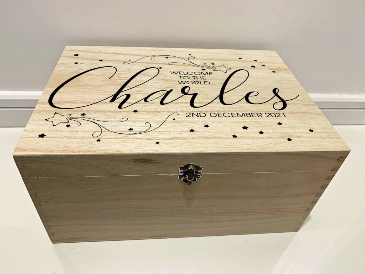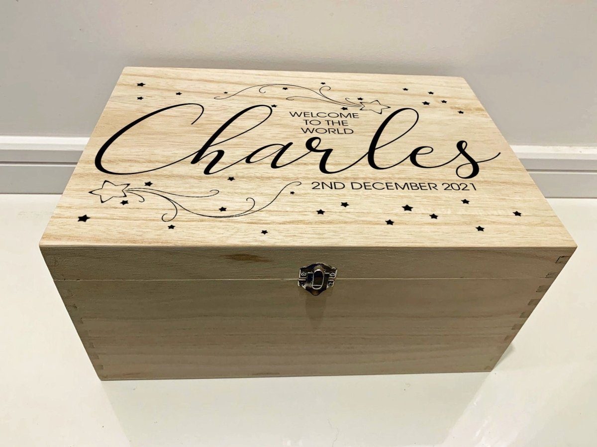 大型个性化雕刻木制婴儿纪念品盒,带流星