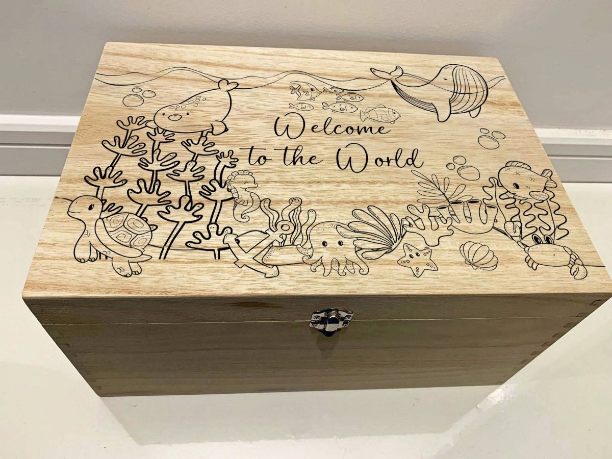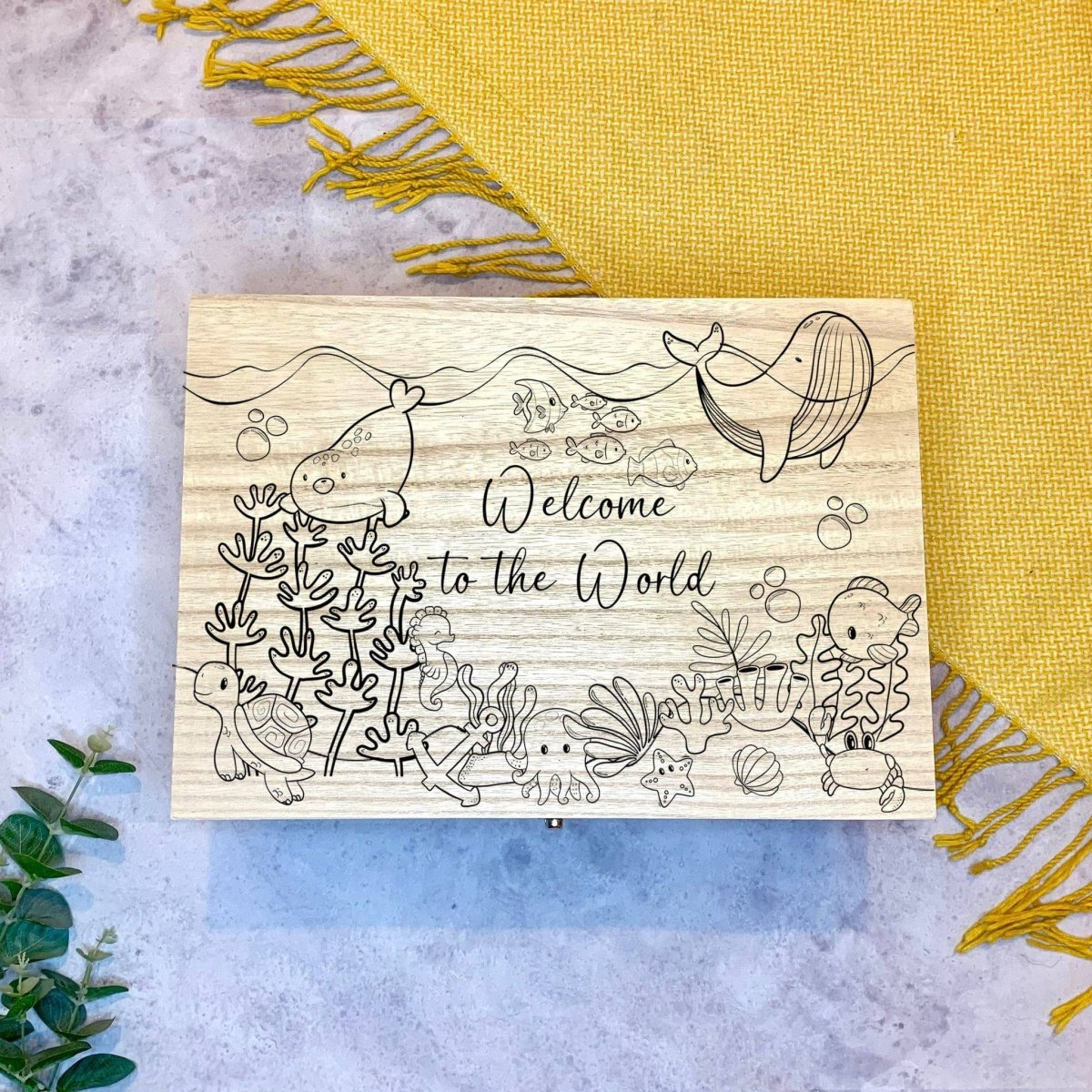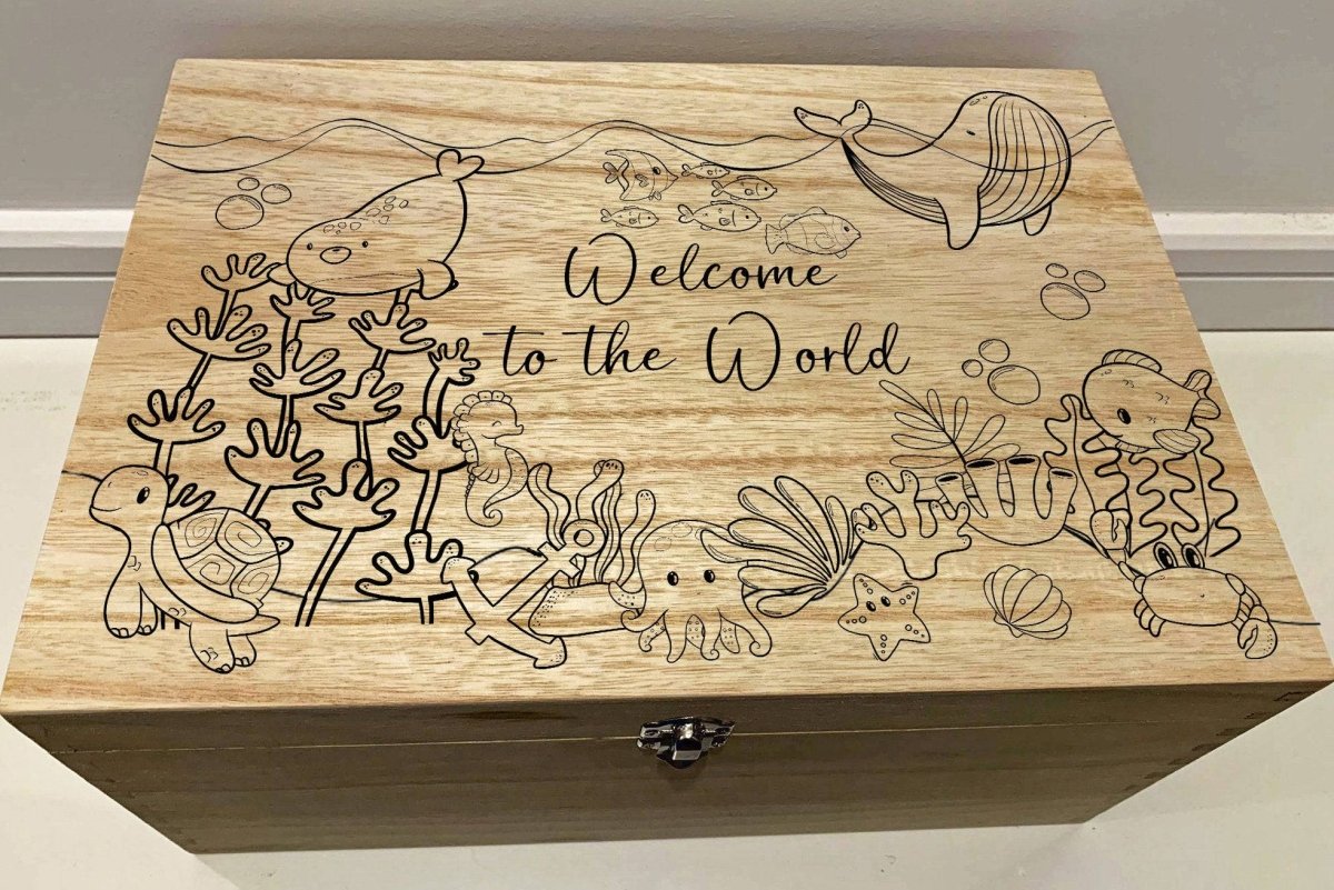 大型个性化雕刻木制婴儿纪念品记忆盒,带有海底动物