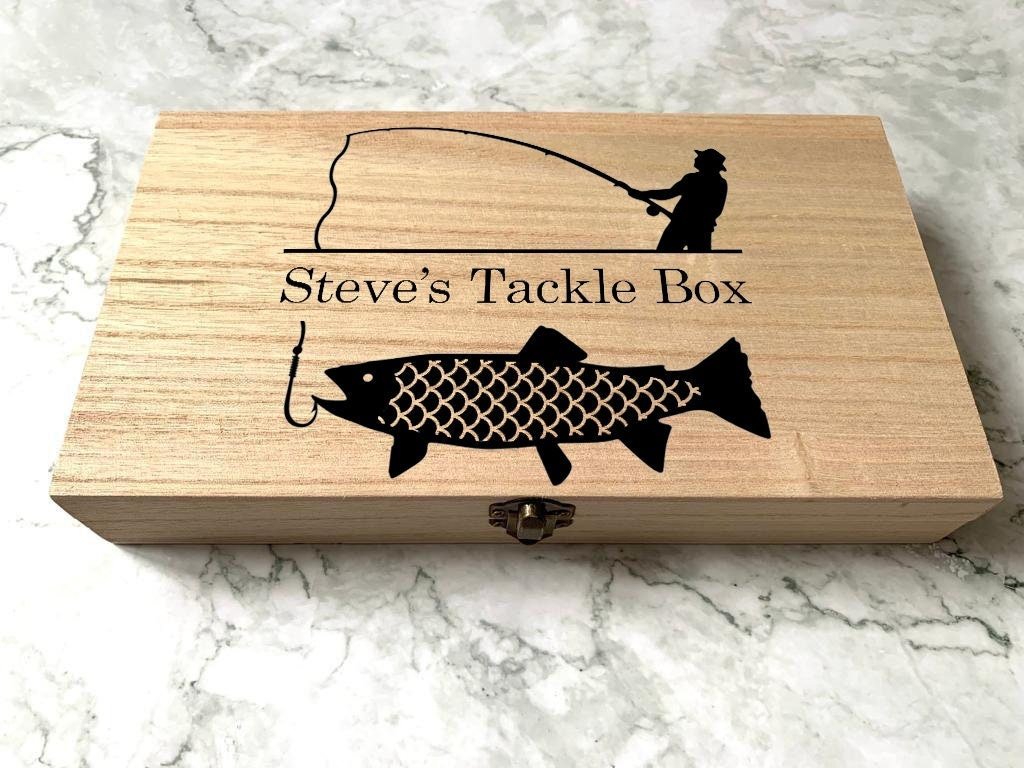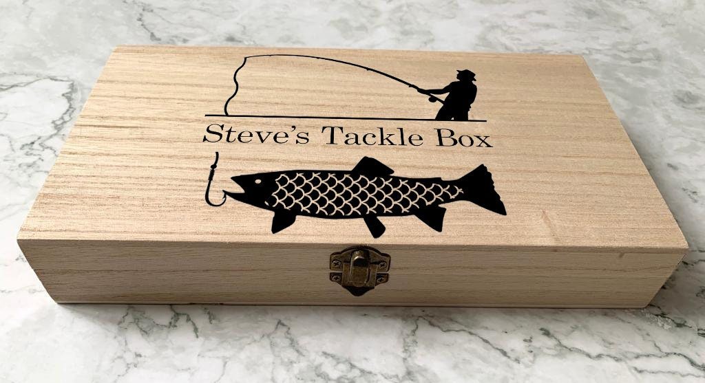 个性化雕刻木制钓鱼箱,带有渔夫和鱼的钓具箱