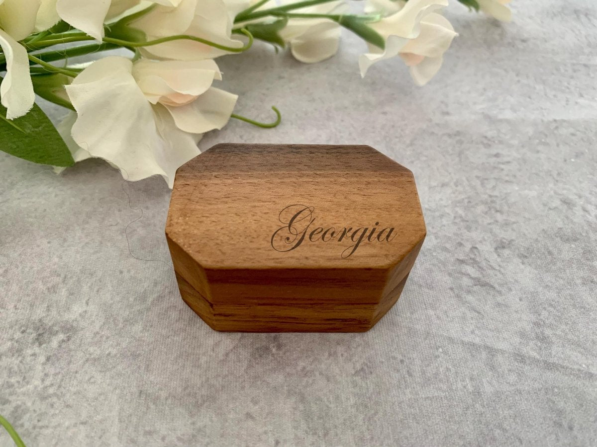 All ring boxes are made from Walnut, and have a choice of velvet inserts.