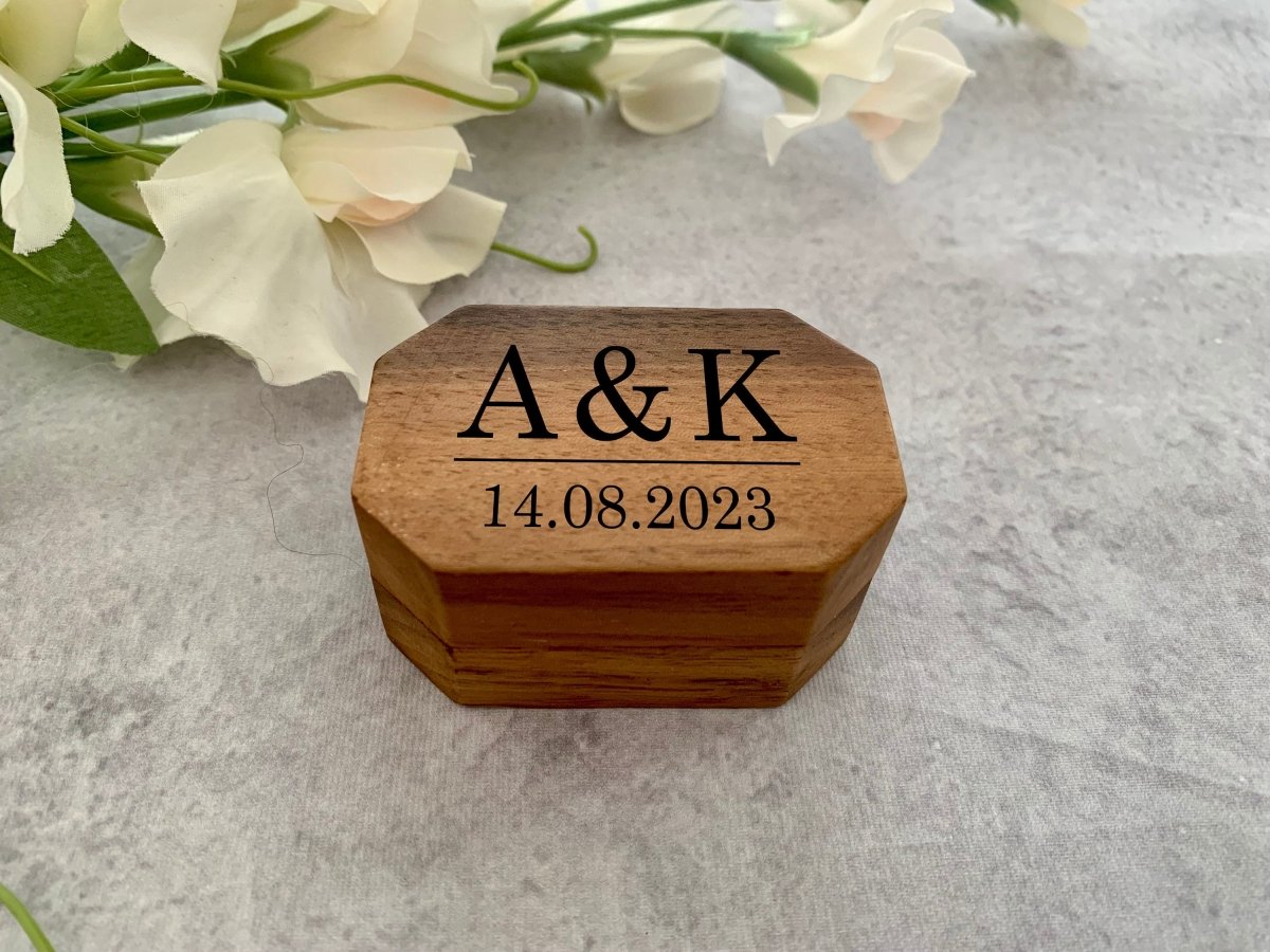 个性化六角形雕刻木制结婚戒指盒,带首字母的订婚戒指盒,周年纪念礼物
