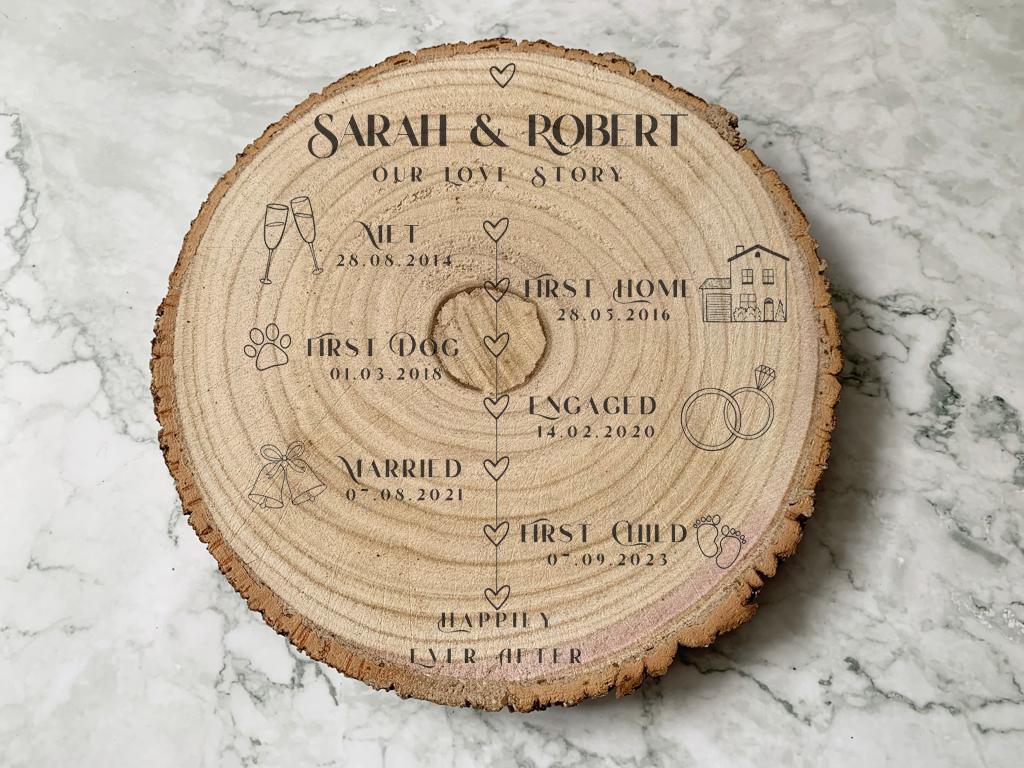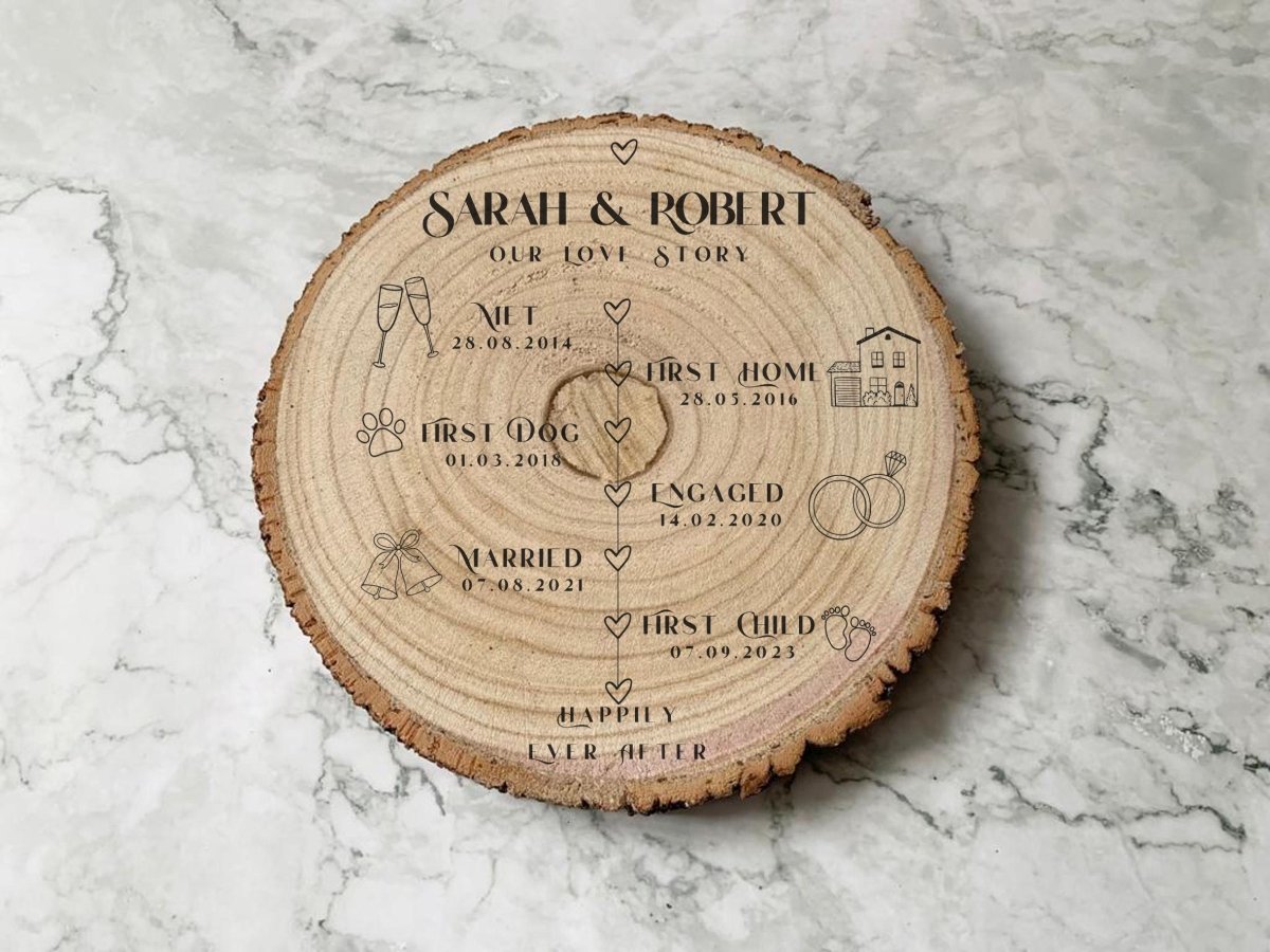 Celebrate your 5th wedding anniversary with a unique personalised gift. This engraved log slice features a timeline of your love story, including special dates, like when you met, your engagement, your wedding, making it a special decoration. Made from a wooden log slice, this plaque is perfect for a couple who appreciates sentimental and thoughtful presents.