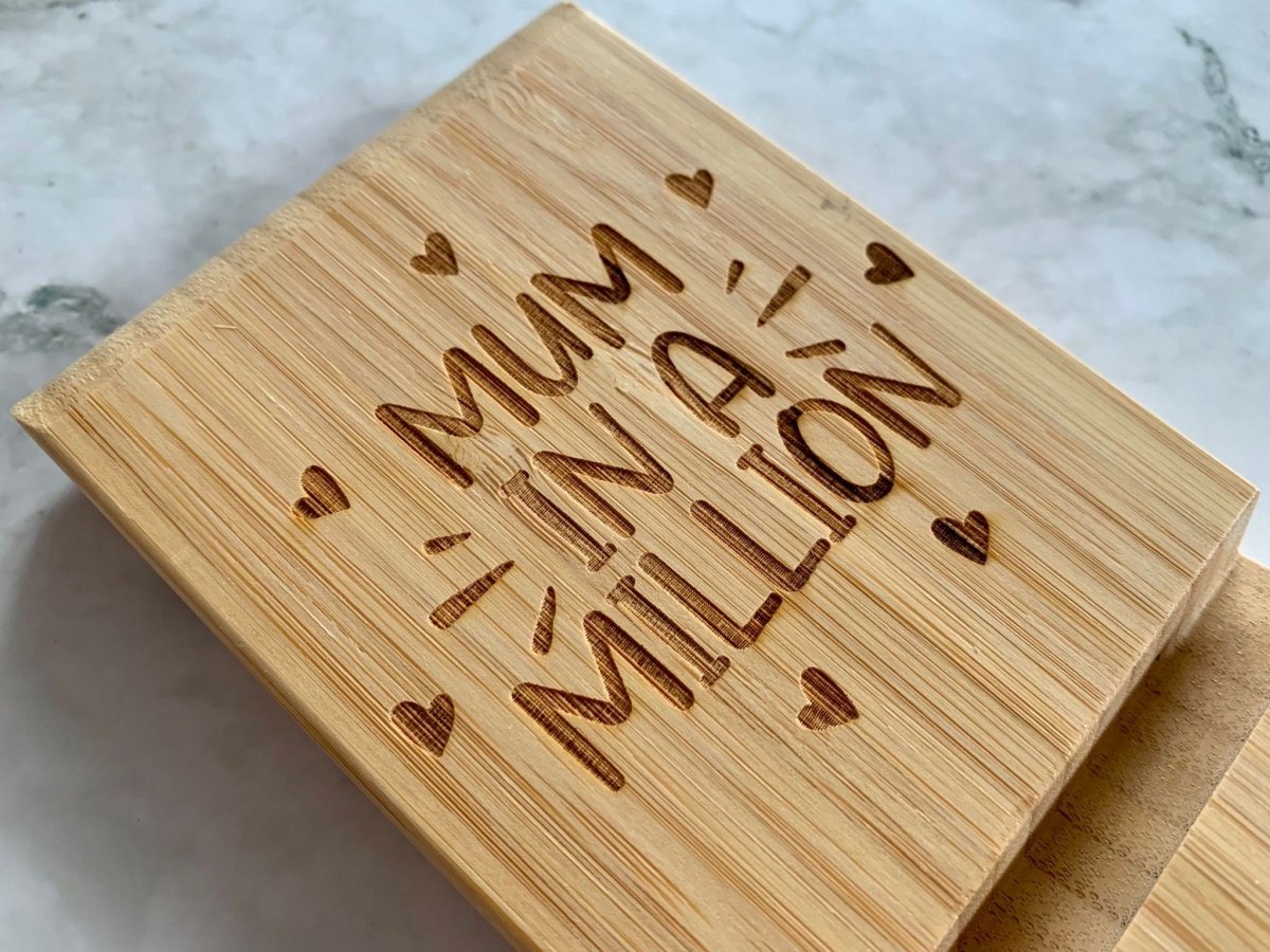 一种精致的、独一无二的手机和平板电脑支架,采用优质竹子制成,上面刻有“百万妈妈”的爱意,并且可以用姓名首字母、名字或特殊信息个性化心形,为送给妈妈的任何礼物增添特别的感觉。