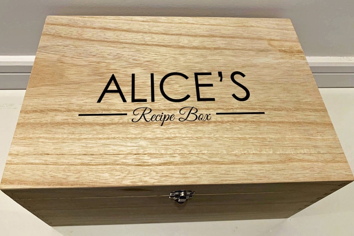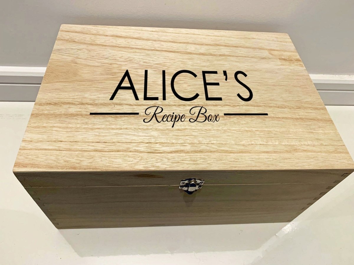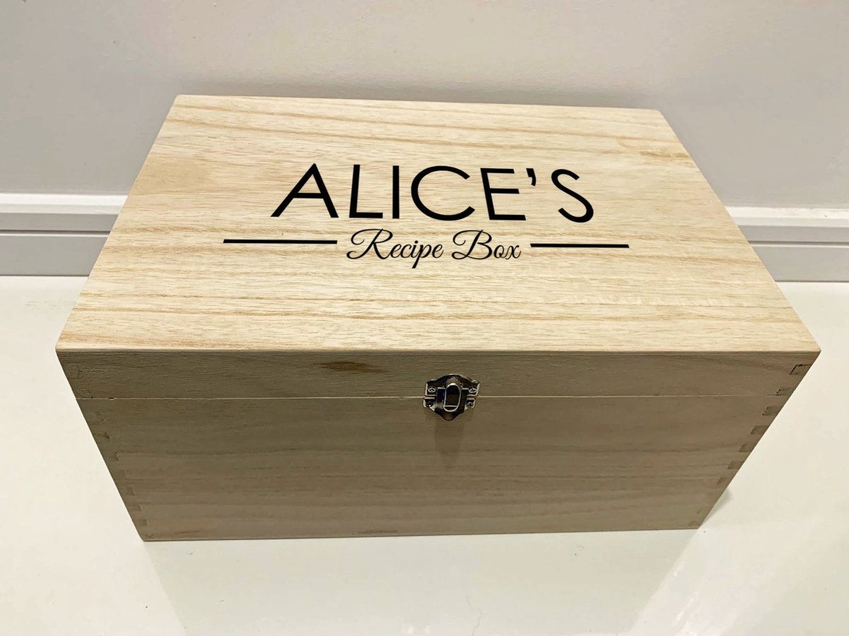 大型个性化雕刻木制食谱盒这款专业激光蚀刻记忆盒是存放珍贵回忆的完美礼物。我们可以在这些盒子上蚀刻任何字符,因此请随意提供任何名称和详细信息。请务必仔细检查拼写是否正确,因为我们会准确复制您输入的内容!