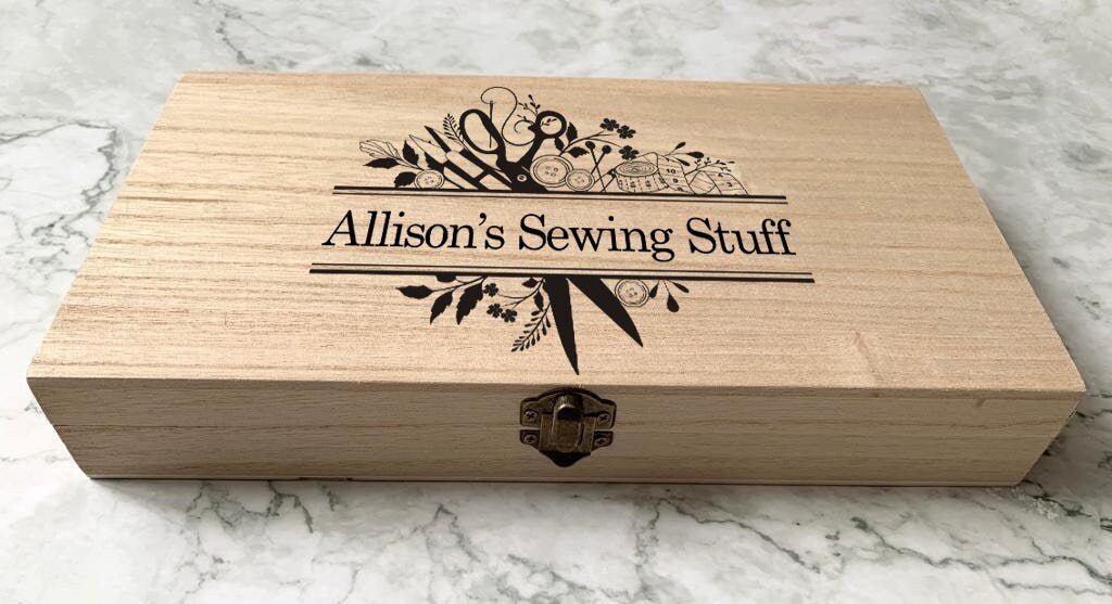 个性化雕刻木制缝纫盒,配有剪刀、针和线