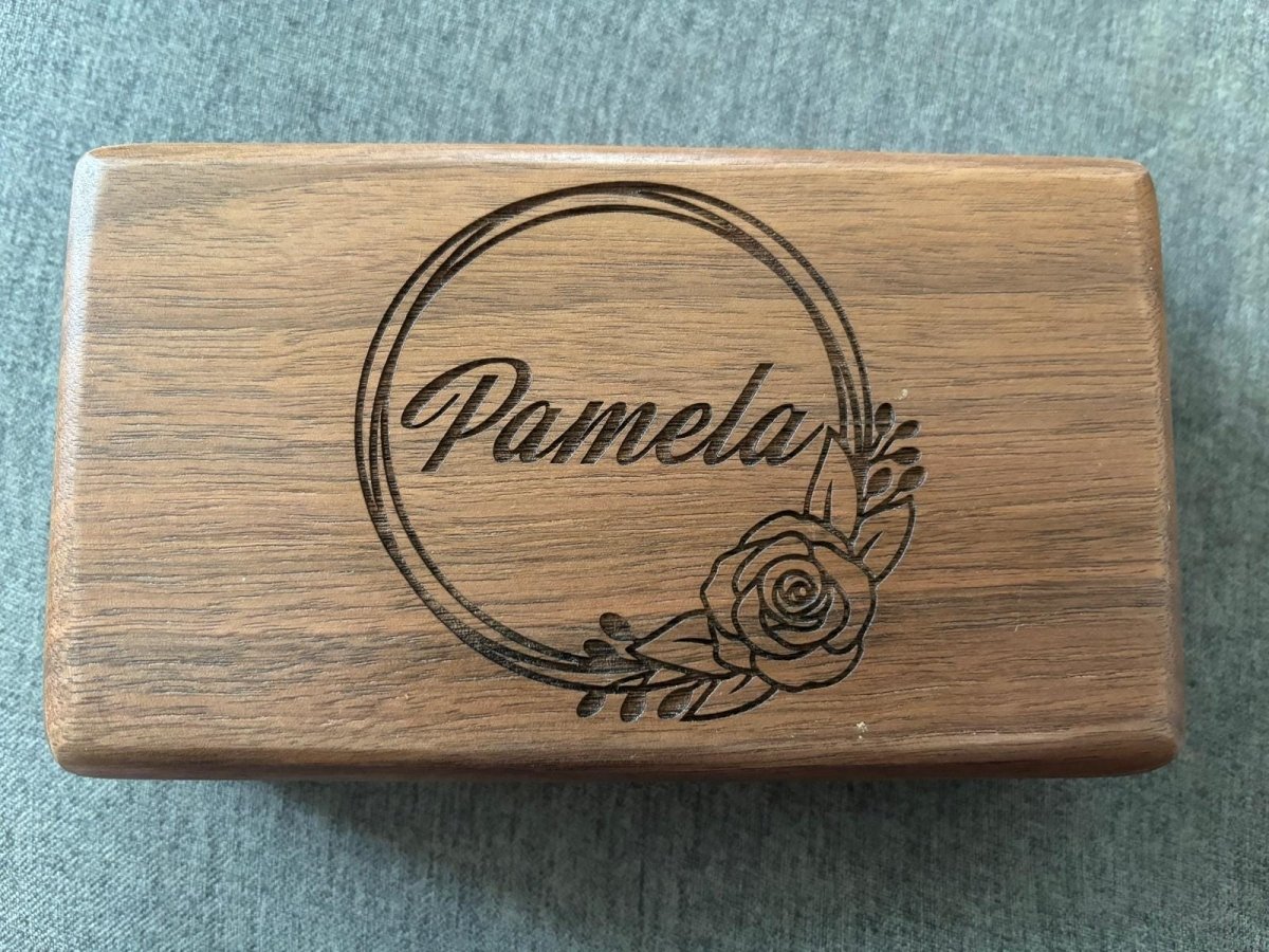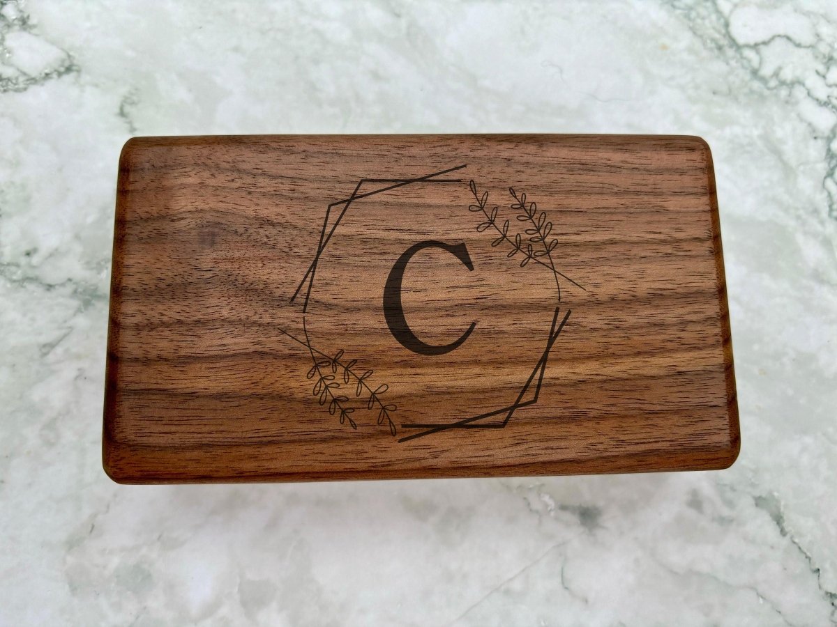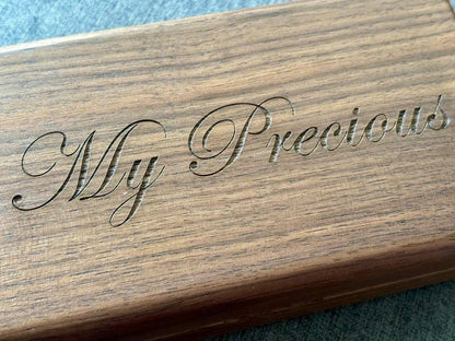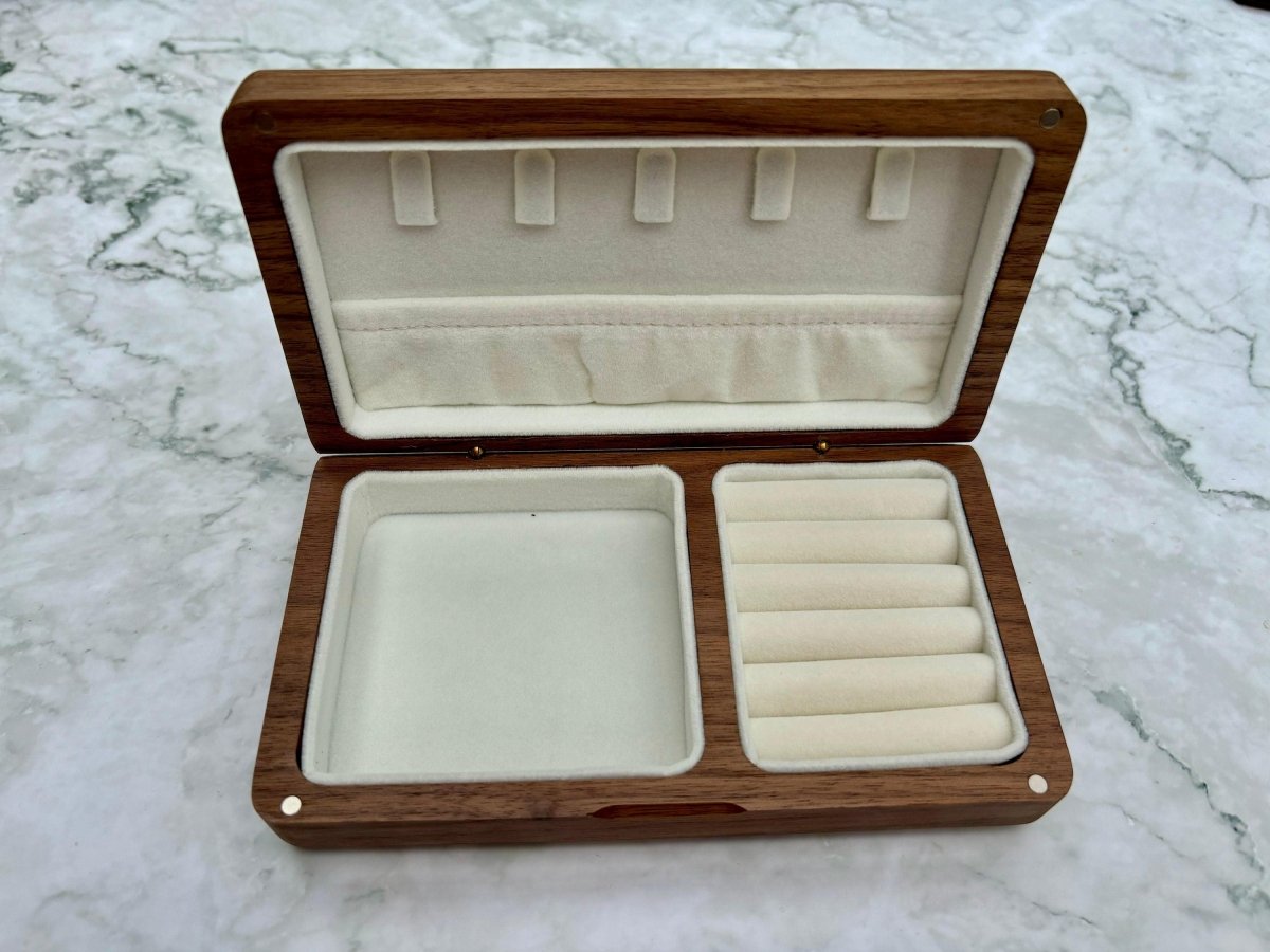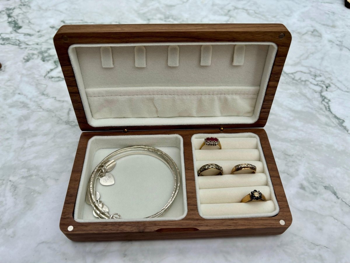 This elegant walnut travel jewellery box can be personalised with an engraved design and is perfect for travel or organising your accessories. There is plenty of room for rings, earrings, necklaces, bracelets and bangles to nestle inside the beautifully velvet lined case. The perfect gift for that special someone, or as a gift for your bridesmaids.