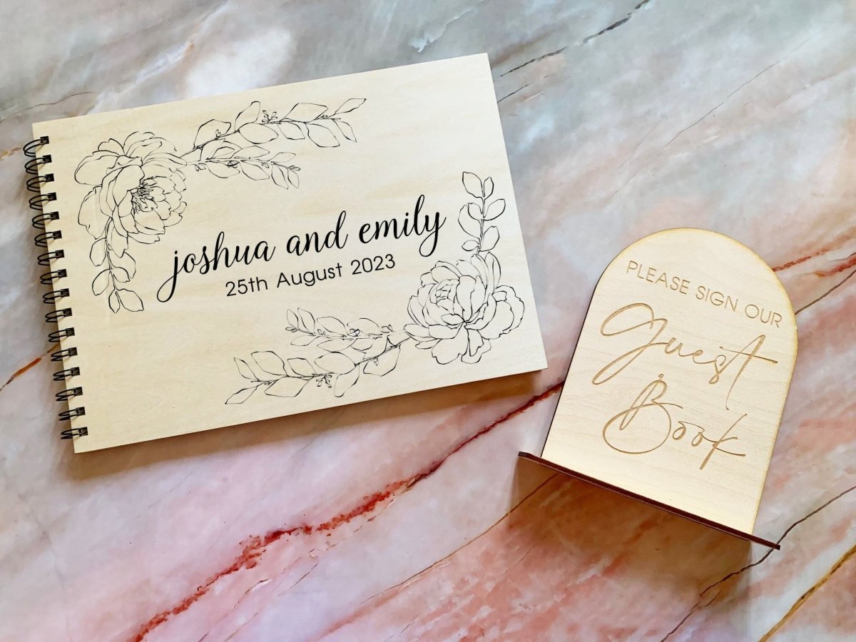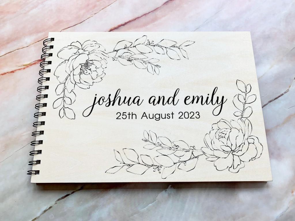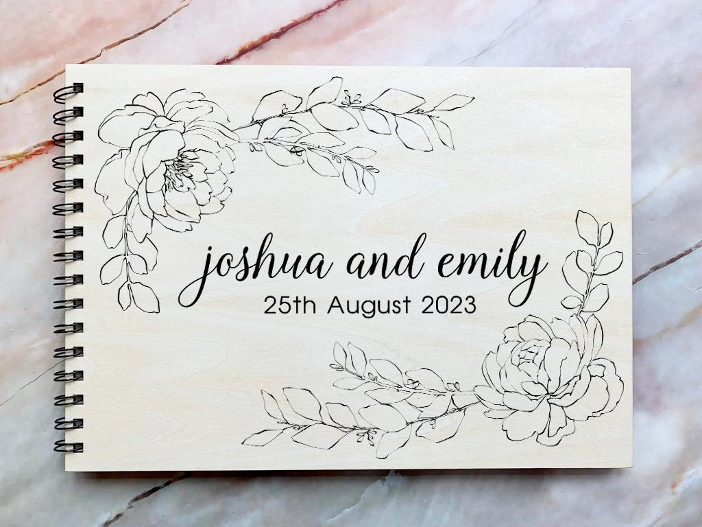 带有牡丹的个性化雕刻木制婚礼宾客书,婚礼相册,婚礼相册,婚礼礼物,