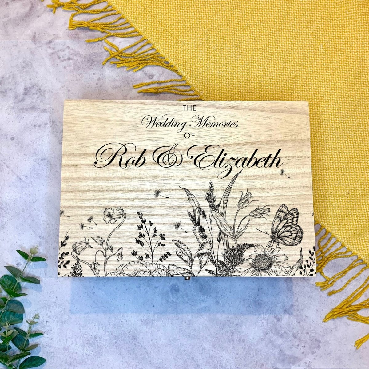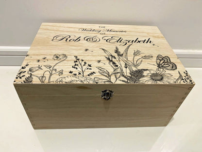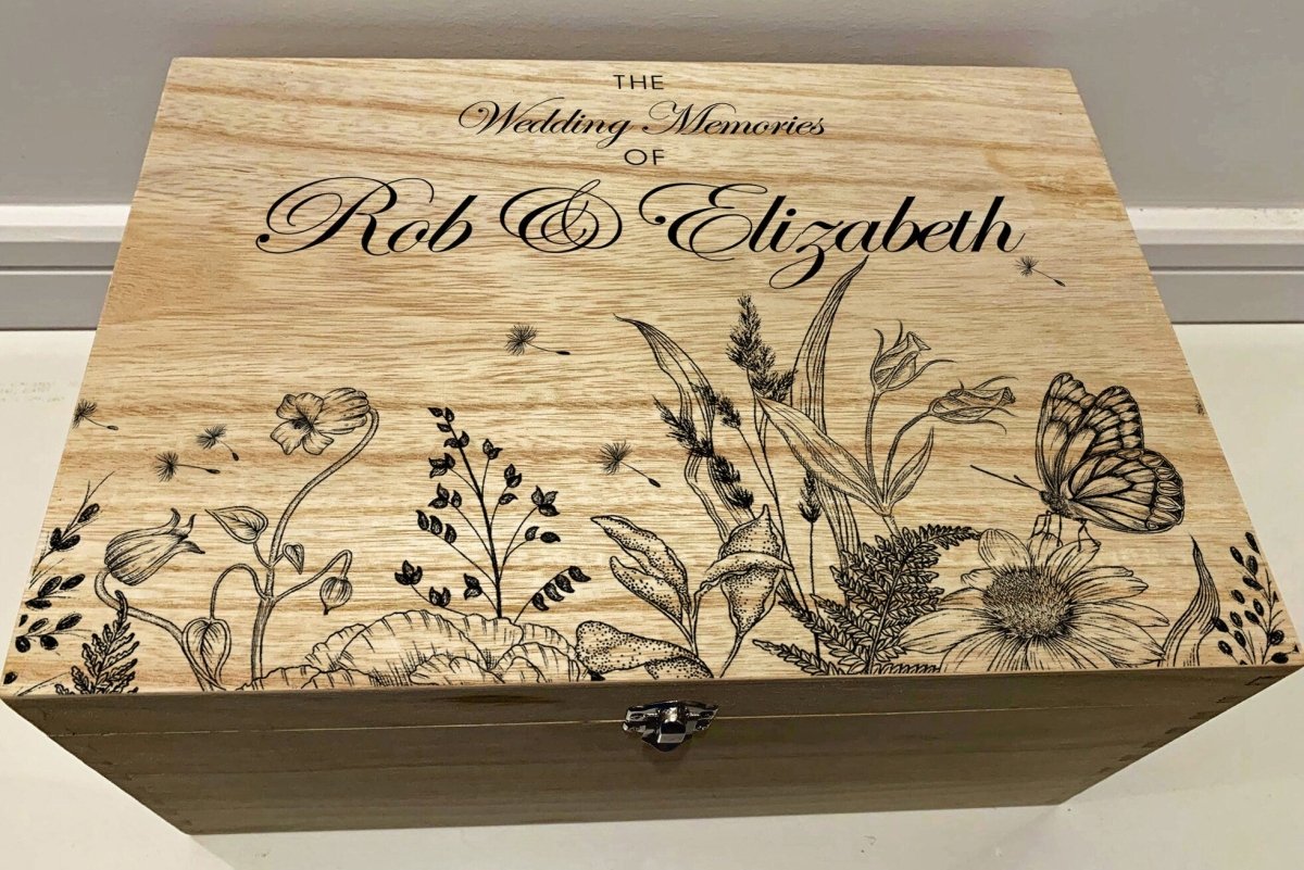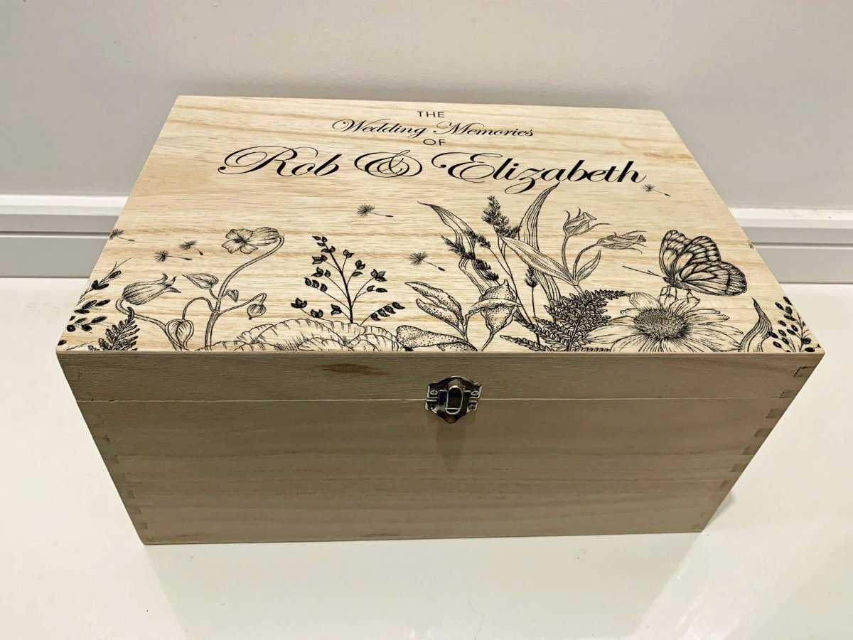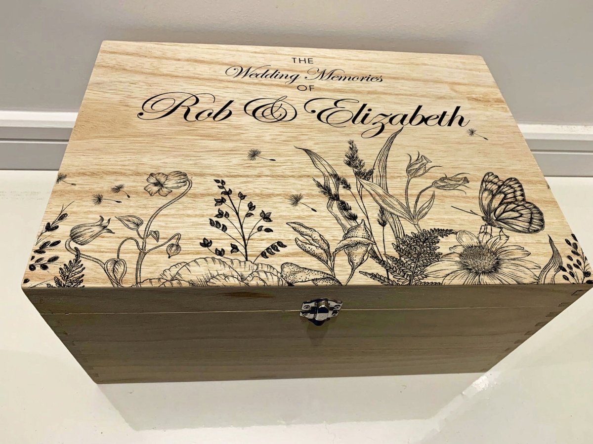 大型个性化雕刻木制婚礼纪念品记忆盒,带植物花卉