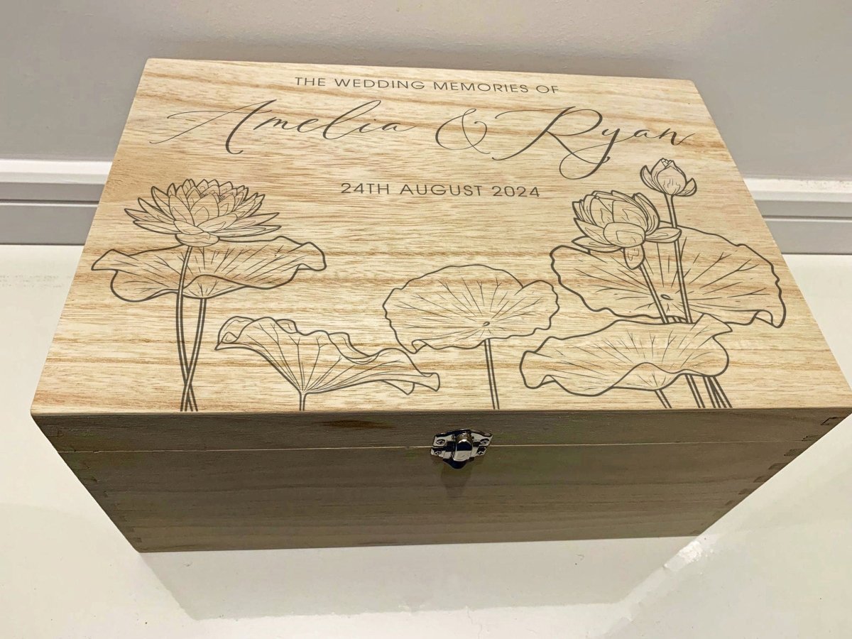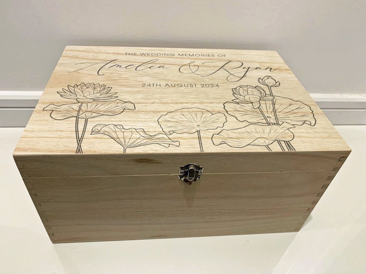 Preserve your wedding memories in style with our Personalised Wedding Keepsake Box. Engraved on high-quality wood, this box features a beautiful lotus water lily design and can be personalised with your names and wedding date. A perfect way to cherish and store your special memories.